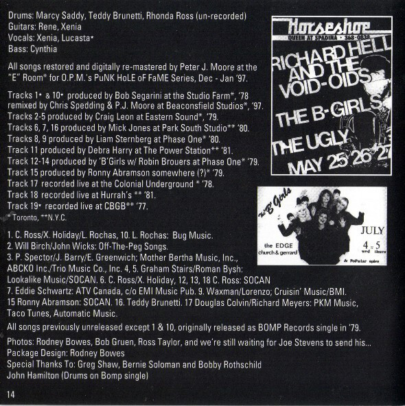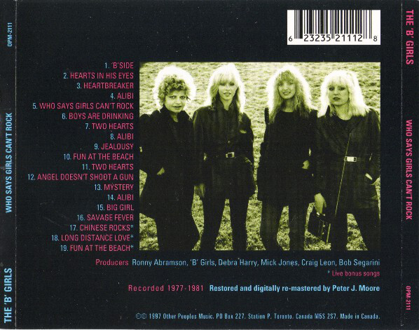The B-Girls also provided background vocals for Stiv Bators on his Disconnected LP (1979), and for Blondie on Autoamerican (1980) after being spotted live at the Whisky a Go Go in L.A.