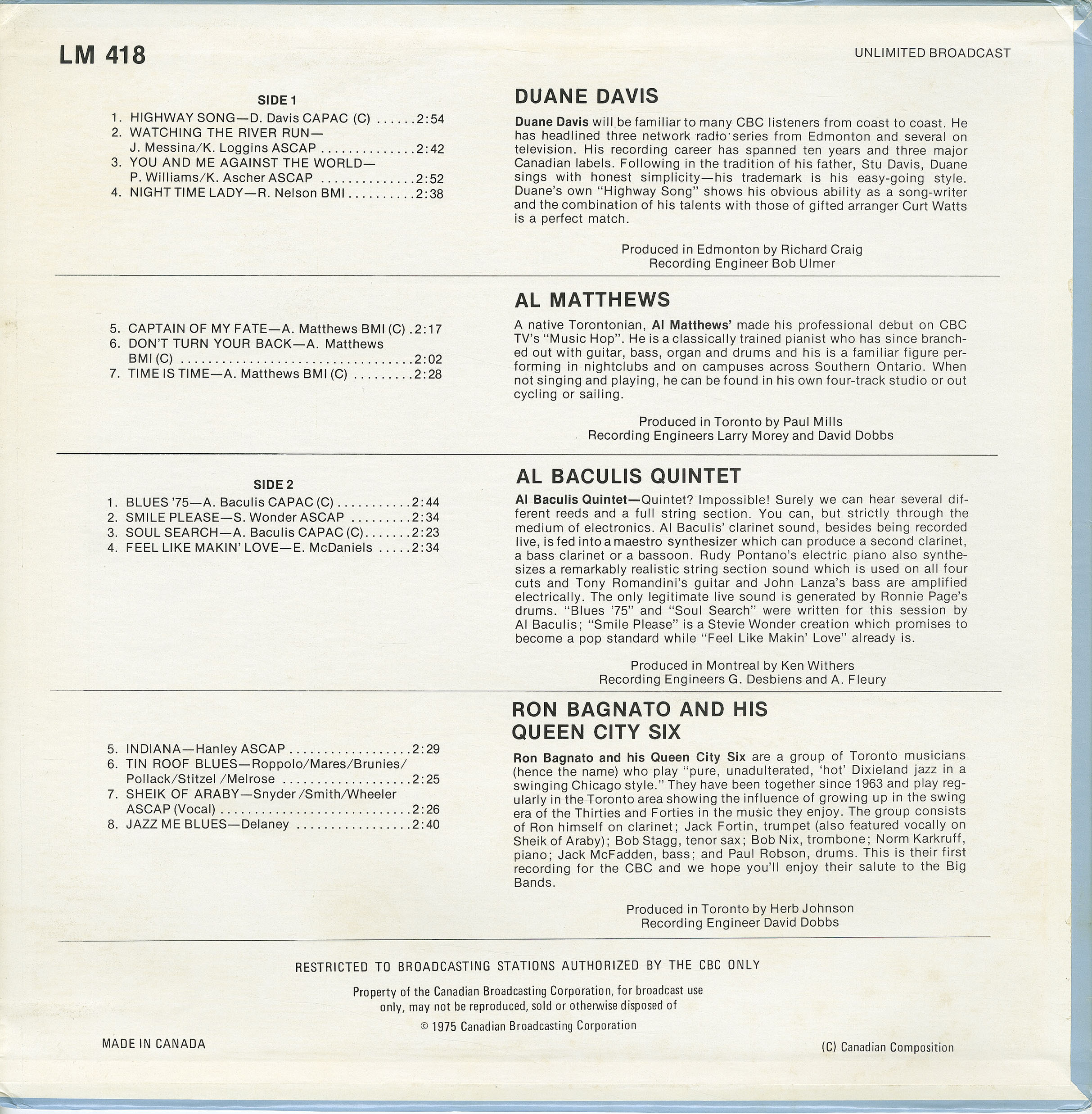 "Blues '75" and "Soul Search" were written for this session by Al Baculis; "Smile Please" is a Stevie Wonder creation which promises to become a pop standard while "Feel Like Makin’ Love" already is.