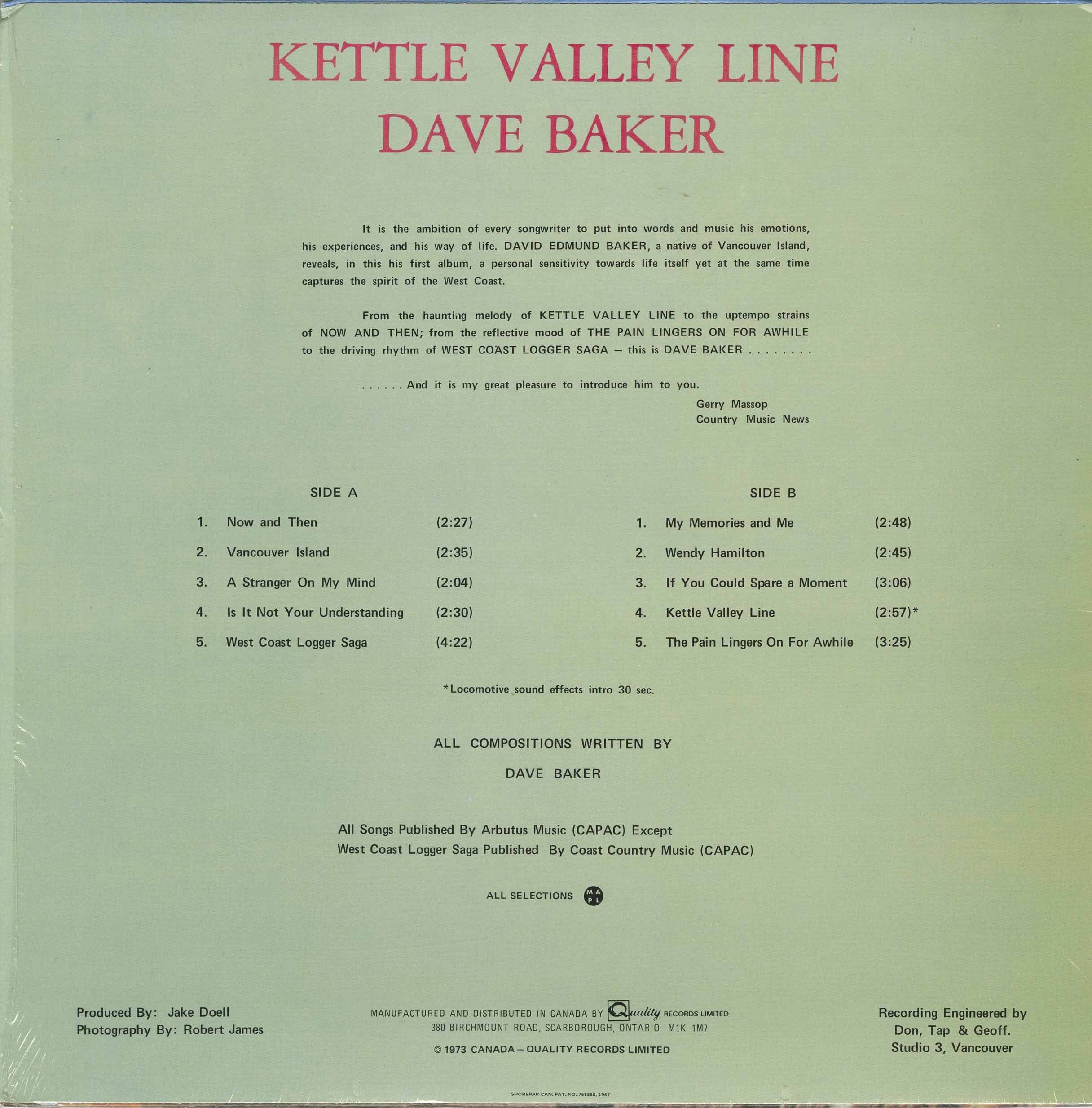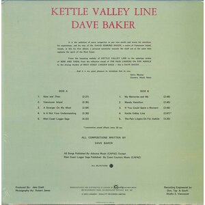 “It is the ambition of every songwriter to put into words and music his emotions, his experiences, and his way of life. Dave Edmund Baker, a native of Vancouver Island, reveals, in this his first album, a personal sensitivity towards life itself yet at the same time captures the spirit of the West Coast. From the haunting melody of “Kettle Valley Line” to the uptempo strains of “Now and Then”; from the reflective mood of “The Pain Lingers On For Awhile” to the driving rhythm of West Coast Logger Saga – this is Dave Baker…And it is my pleasure to introduce him to you.”