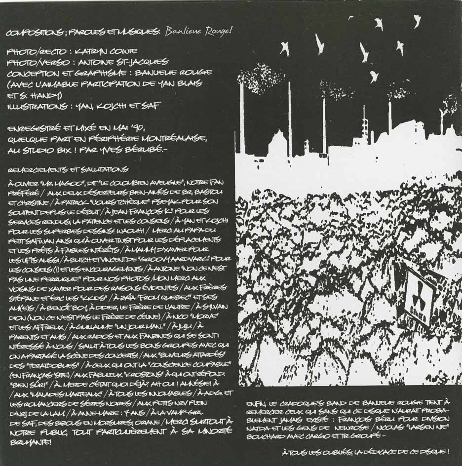 Trop occupé à gérer ses dissonances internes, le trio ne prend pas immédiatement conscience du chemin parcouru par son démo. La cassette est pourtant tombée dans l’oreille du label français Division Nada piloté par François, chanteur-parolier des défunts Bérurier Noir. La filiation s’impose : scandés sur une boîte à rythmes minimaliste et des accords de guitare acérés, les textes de Banlieue Rouge dressent l’inventaire d’une époque qui ne sort pas indemne de la guerre froide. Par delà les chroniques suburbaines résonnent déjà des échos des quartiers du monde et une conscience sociale affirmée. Conscient de son adolescence artistique, le groupe prévient cependant d’un titre : En attendant demain. Mais Division Nada veut promulguer sans tarder cet acte constitutif qui paraît en France en janvier 1991. Également lancé au cours de l’automne 1990 dans la marginalité bientôt mythique des Foufounes Électriques, ce premier opus recueille quelques mentions médiatiques qui entérinent les encouragements reçus de l’autre côté de l’Atlantique. Reste encore à Banlieue Rouge à montrer son vrai visage.