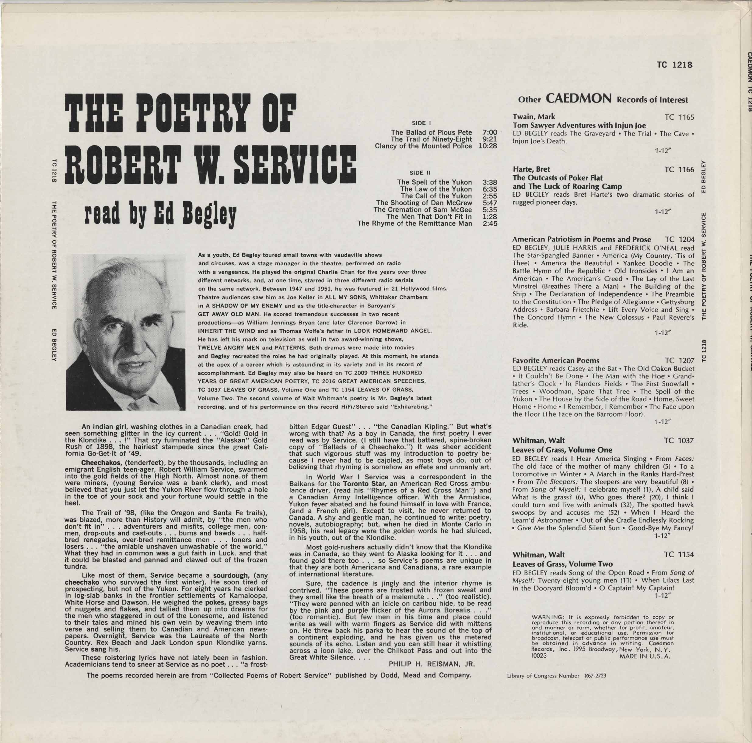 Ed Begley - The Poetry of Robert Service BACK