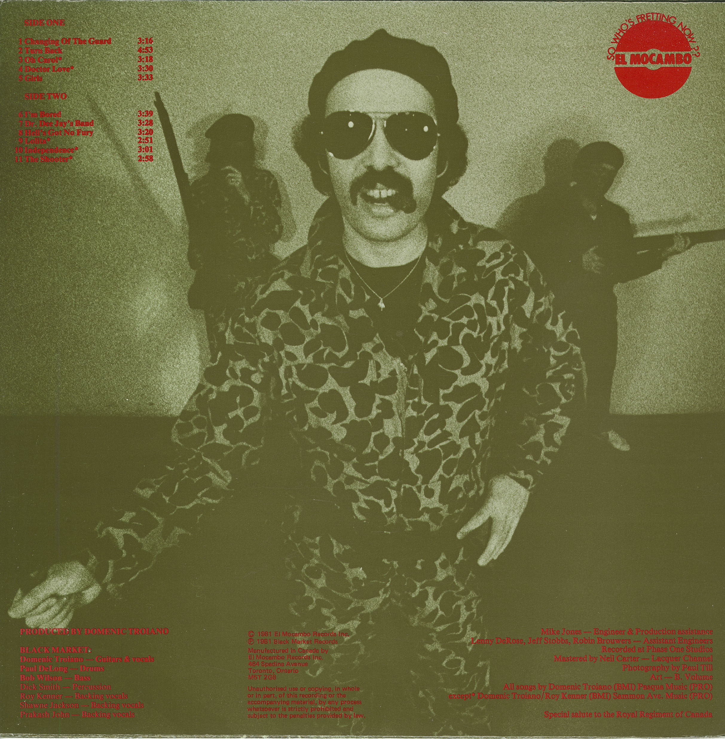 Domenic Troiano reemerged in late 1980 with a new musical project. Black Market featured Troiano, Bob Wilson, and Paul DeLong in a no-frills power trio setting. "I've been typecast in a jazz-rock vein because the last three albums with Capitol had a variety of stuff, including some jazzy moments," Troiano said in 1981. "Black Market hopefully will remind people that I've been playing hard-edged, aggressive music for twenty years. I've been rockin' since high school and I don't intend to stop now." In the age of new wave and a minimalist approach to rock, Black Market seemed very appropriate for the times. Changing of the Guard, the group's debut album, was issued on independent label El Mocambo Records in 1981. Despite Troiano's enthusiasm about Black Market, the project only captured the attention of hardcore fans.