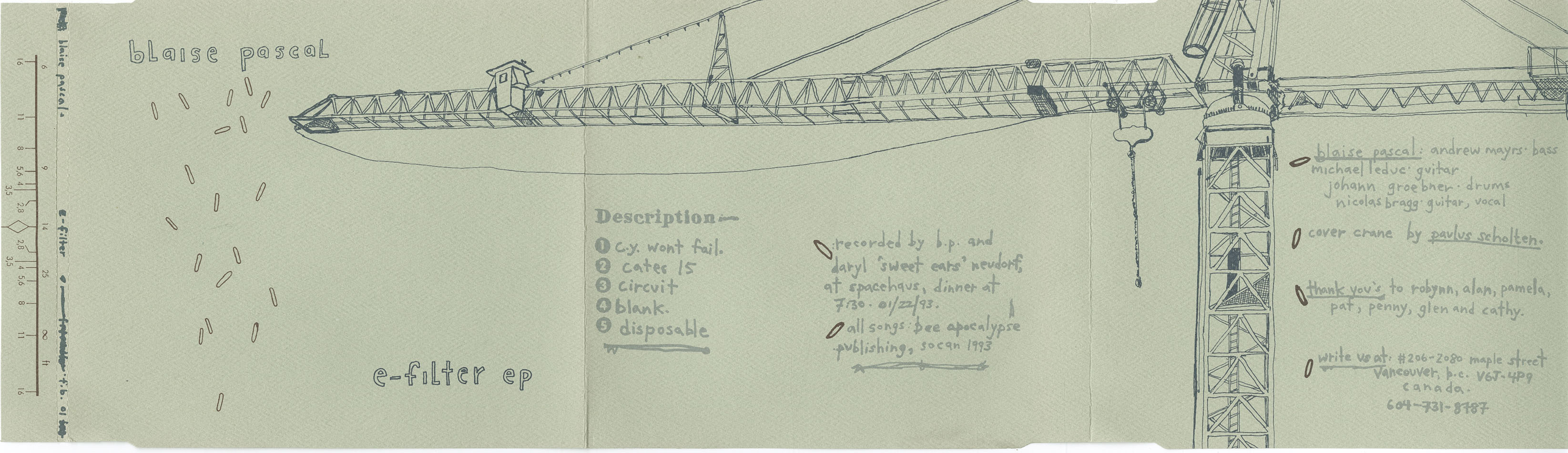 Named after the 17th-century French philosopher and mathematician, Blaise Pascal were a short-lived indie rock band out of Vancouver, active in the early 1990s. The group released two self-financed records—a 5-song EP in 1993 and the 8-song mini-LP Foreward in 1994—before fading back into obscurity. The LP pressing of Foreward included one exclusive track, “Only the Stars” (Side B, Track 1), not found on the CDEP edition.