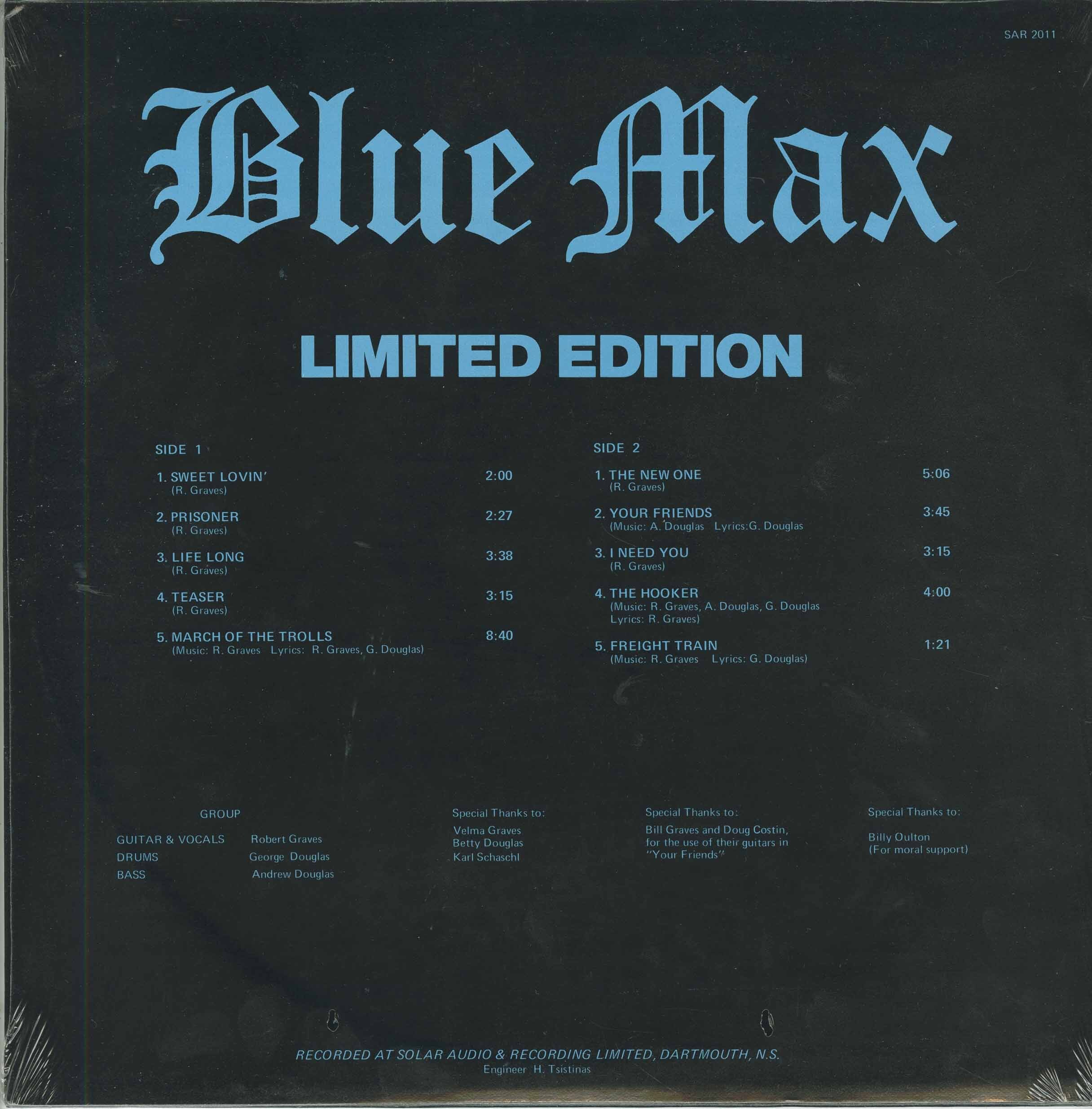 From the beginning, Blue Max played many of their original songs in every performance and soon felt the need to create an album of their own. On their Christmas vacation from school, in 1976, they traveled to Halifax, to the only studio in the area at the time and recorded "limited Edition", which was released soon after. It was an apt title since only 1,000 copies were issued but it served it's purpose well as a promotional tool and a keepsake for some of the most ardent fans. It captured the unique flavor of rock that was Blue Max. Soon after it's release, Blue Max started playing the bars as well as school dances, even though they were still underage themselves, and they discovered a whole new audience. They also began promoting their own Concerts in arenas around the Maritimes during the summer months when schools were not available. For two more years the band enjoyed regional success. After seven years together, they all felt the need for some change and Blue Max disbanded with each of them going their own separate ways. George continued to play drums part time in local bands and pursue other hobbies of collecting Corvettes and playing hockey.He is now manager of two NAPA auto supply stores in his home town of Amherst, and Springhill, and is the father of two sons. Andrew put down his bass and pursued his first love, the guitar, and was reunited with me twice in the twin guitar bands "Achilles" and "Mother's Fear". He continued to be a "gun for hire" guitarist and after years of national and international touring, settled in Halifax, where he is currently working on his first solo recording.