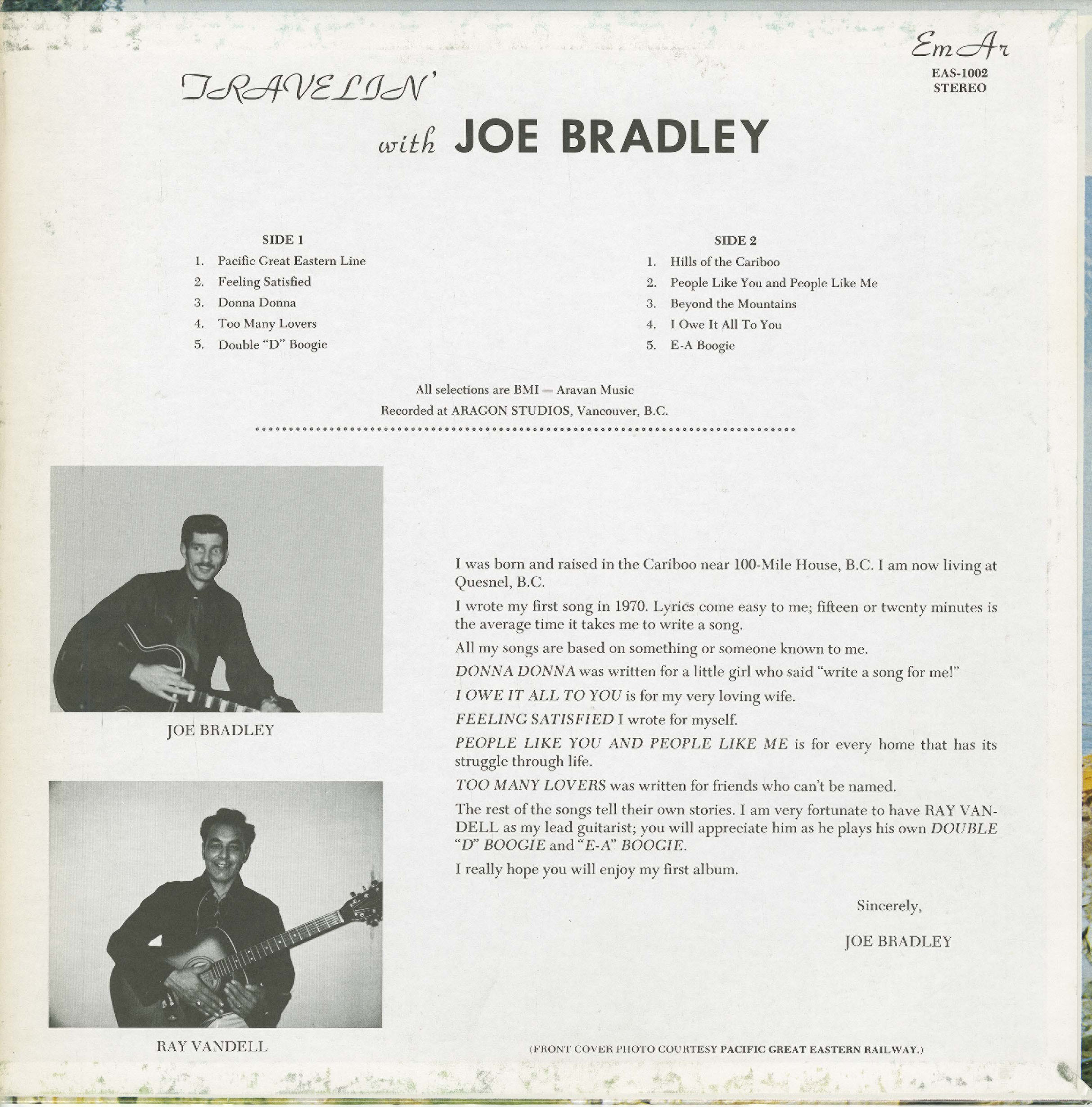 In the early 1970s, Joe recorded his first and only LP, Travelin’ with Joe Bradley, at Aragon Studios in Vancouver with his friend and lead guitarist Ray Vandell. The album features heartfelt original songs like “Donna Donna,” “I Owe It All to You,” and “Pacific Great Eastern Line,” many of which were inspired by Joe’s own life, friends, and family.