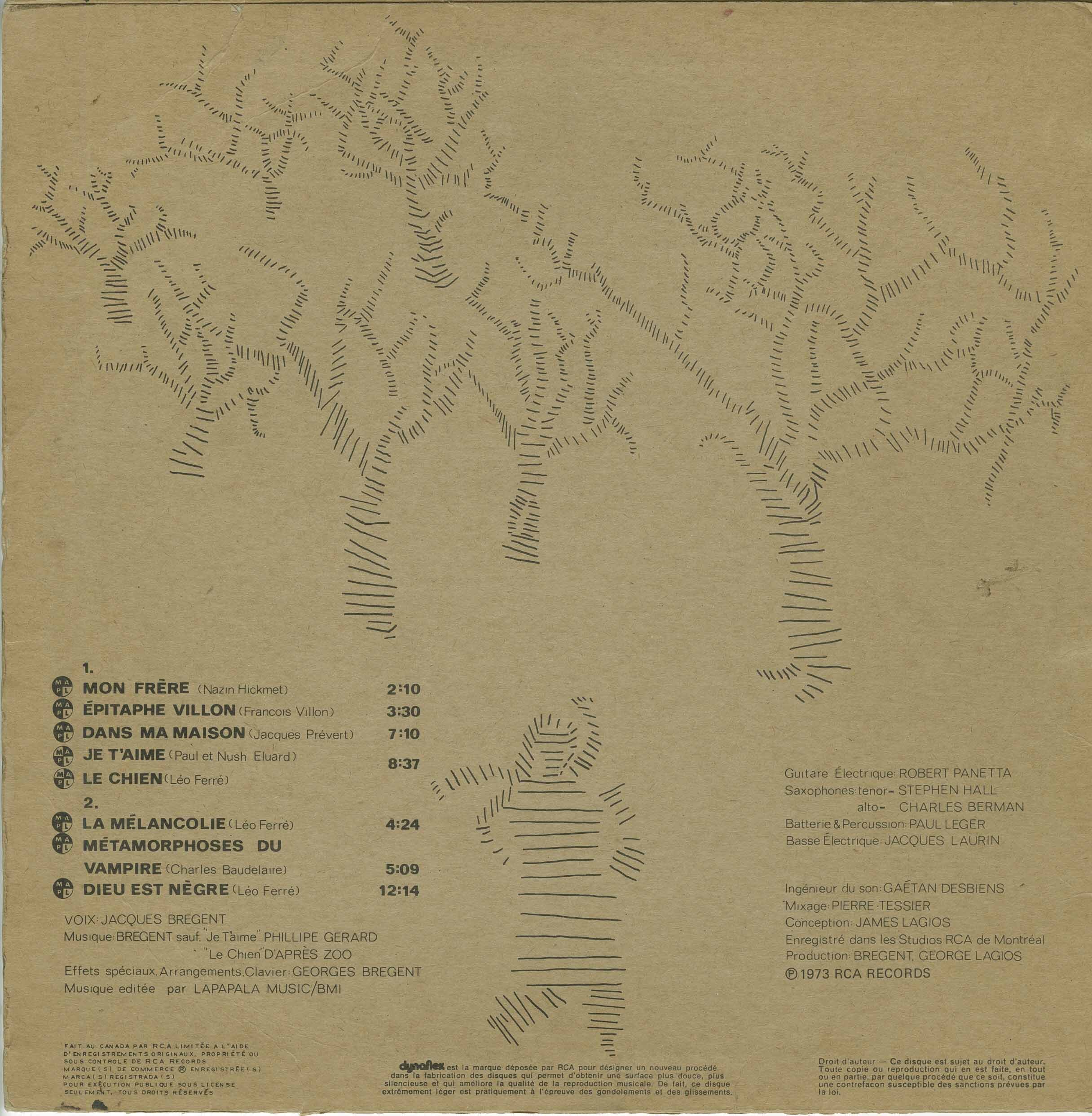 The highly experimental Poussière Des Regrets takes the poetry of various French and Quebecois writers and sets it to dark, avant-garde jazz-rock. Works by the likes of Verlaine, Baudelaire, Ferre and Leclerc are broken down into a sort of abstract expressionism that is much more reminiscent of free jazz than prog-rock. Contrast is everything here. Freaky saxophone bursts might dissolve into soft sound effects which are then built up into frantic rants backed by more cacophonous noise. Vocals are delivered in equally dramatic fashion. On the twelve-plus minutes of ‘Dieu est negre’’, a take on a poem by Leo Ferre and probably the closest the album gets to standard rock music, Jacques voice flits from smoky singing to urgent whispering and then outright screaming by the song’s climax.