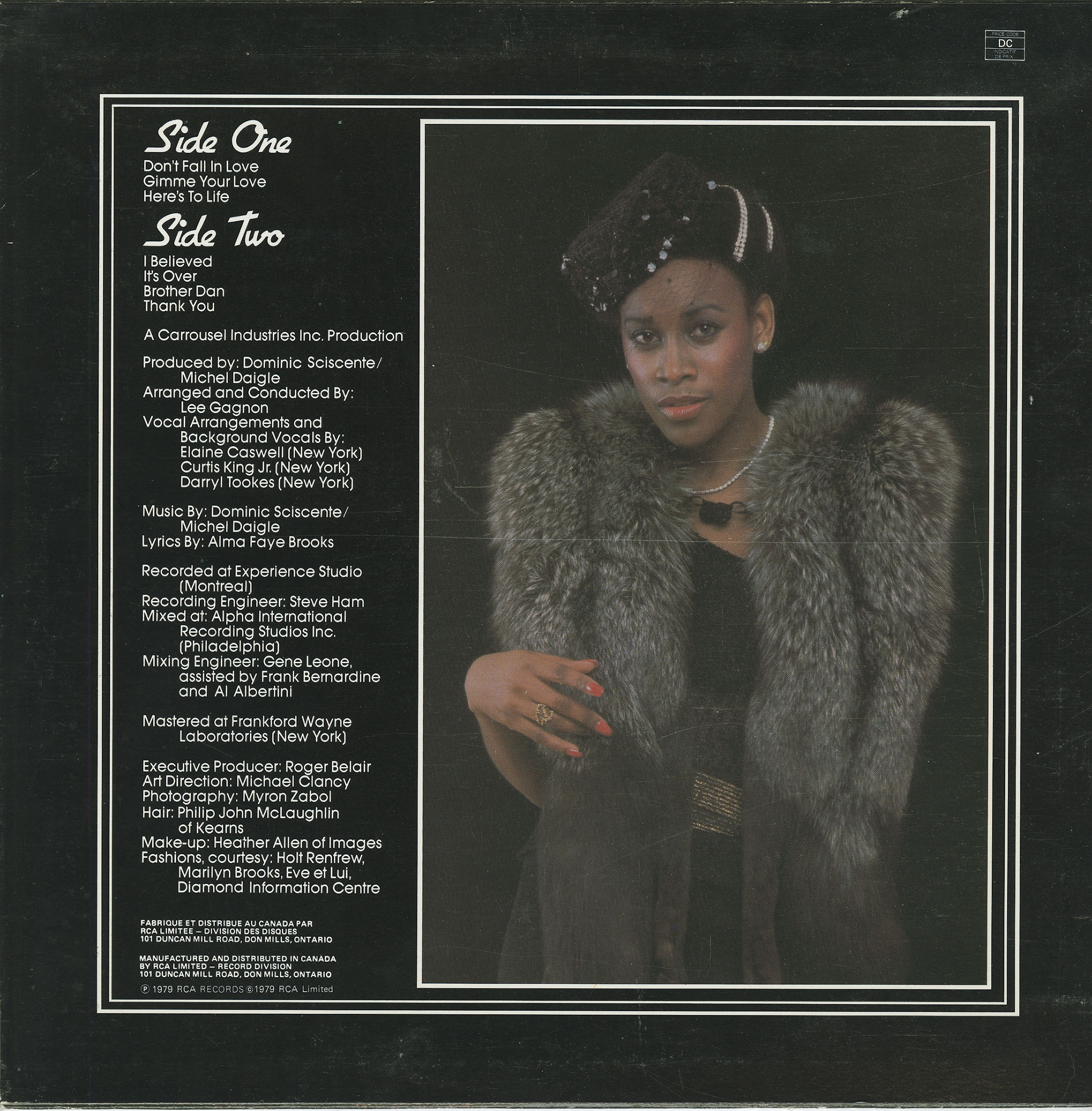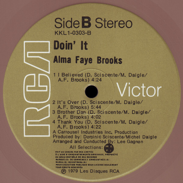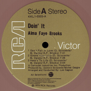In January 1977, at the height of the disco craze – when Montreal was one of the scene’s global epicenters – Alma Faye Brooks burst onto the scene with her March 16, 1977 Juno-nominated American disco hit Stop, I Don’t Need No Sympathy that was released as an RCA records 12” single. "Doin' It" is what followed, getting the attention from many fans of Late '70s Dance music.