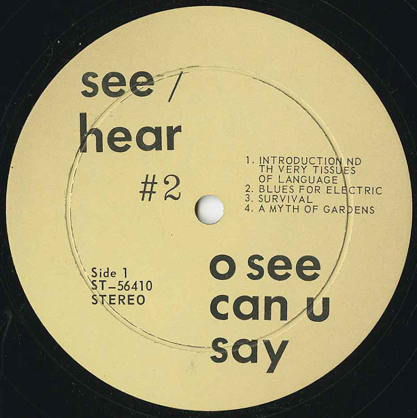 SEE/HEAR is a RECORD MAGAZINE, a quarterly publication of recordings of contemporary sound arts. Contemporary sound arts are usually discussed in terms of certain categories such as electronic music, experimental acoustic music, sound poetry, projective verse, chance music, improvised forms and so on, however what should probably be recognized is that sound arts are continually evolving and to create categories only restricts the way in which we think about sound. Mixed media, combinations of sound and visual arts, or combinations of different modes of sound art, are easily seen as results of our electric environment, and are as valid as the already accepted sound forms. Comes with insert about the recordings. From the insert: A1 for Lennon and Mccartney. A4 was commissioned for the Adelaide 1968 Arts Festival by the Melbourne ISCM, fragments of poetry were chosen at random from the unpublished works of the late Ann Pickburn. A5 is a 30-minute dramatic cantata written for a Masters composition recital and performed at the University of British Columbia in the spring 1968. B4 made September 1968.
