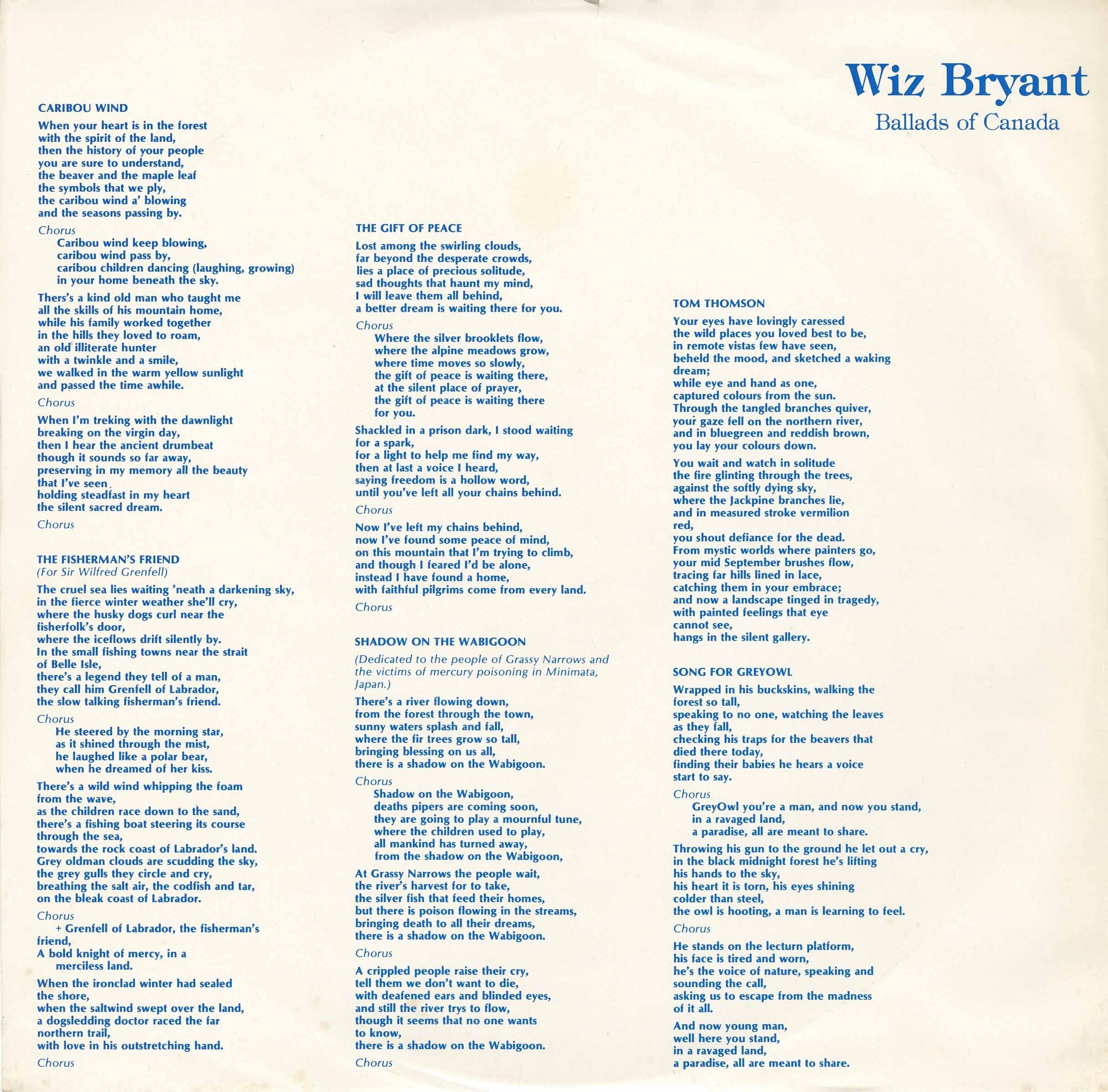 Wiz Bryant is encouraging Canadians to join hands and to feel good about Canada. His lyrics on great Canadians of yesterday and the beauty of our lanscape, arouse curiosity and pride. In his own exuberant way with guitar and voice he is helping us to appreciate Canada's rich diversity. He's battling barriers of distance and indifference with ballads - a painless and pleasant way to know Canada better.