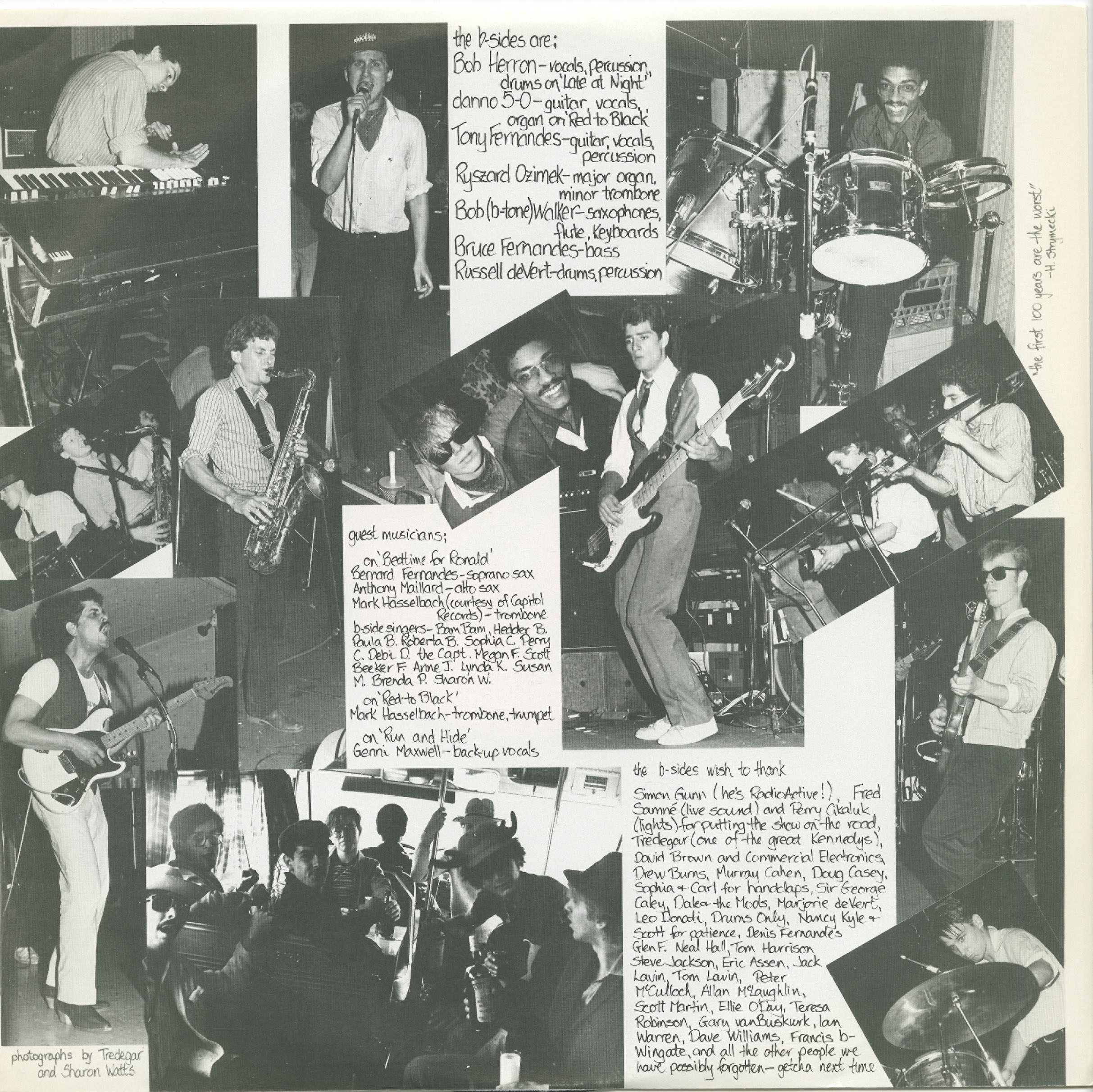 The B-Sides’ lineup featured Bobby Herron (vocals, percussion), Dano 5-0 (guitar, vocals), Tony Fernandes (guitar, vocals), Bob “B-Tone” Walker (sax, flute, keys), Ryszard Ozimek (organ, trombone), Bruce Fernandes (bass), and Russell DeVert (drums). Keyboardist Squire Ozone and a rotating cast of backing singers also contributed. Their songs were often collaboratively written and unapologetically topical—titles like “Bedtime for Ronald (or the USA)” and “Invasion of the Money Snatchers” carried biting social commentary alongside irresistible grooves.