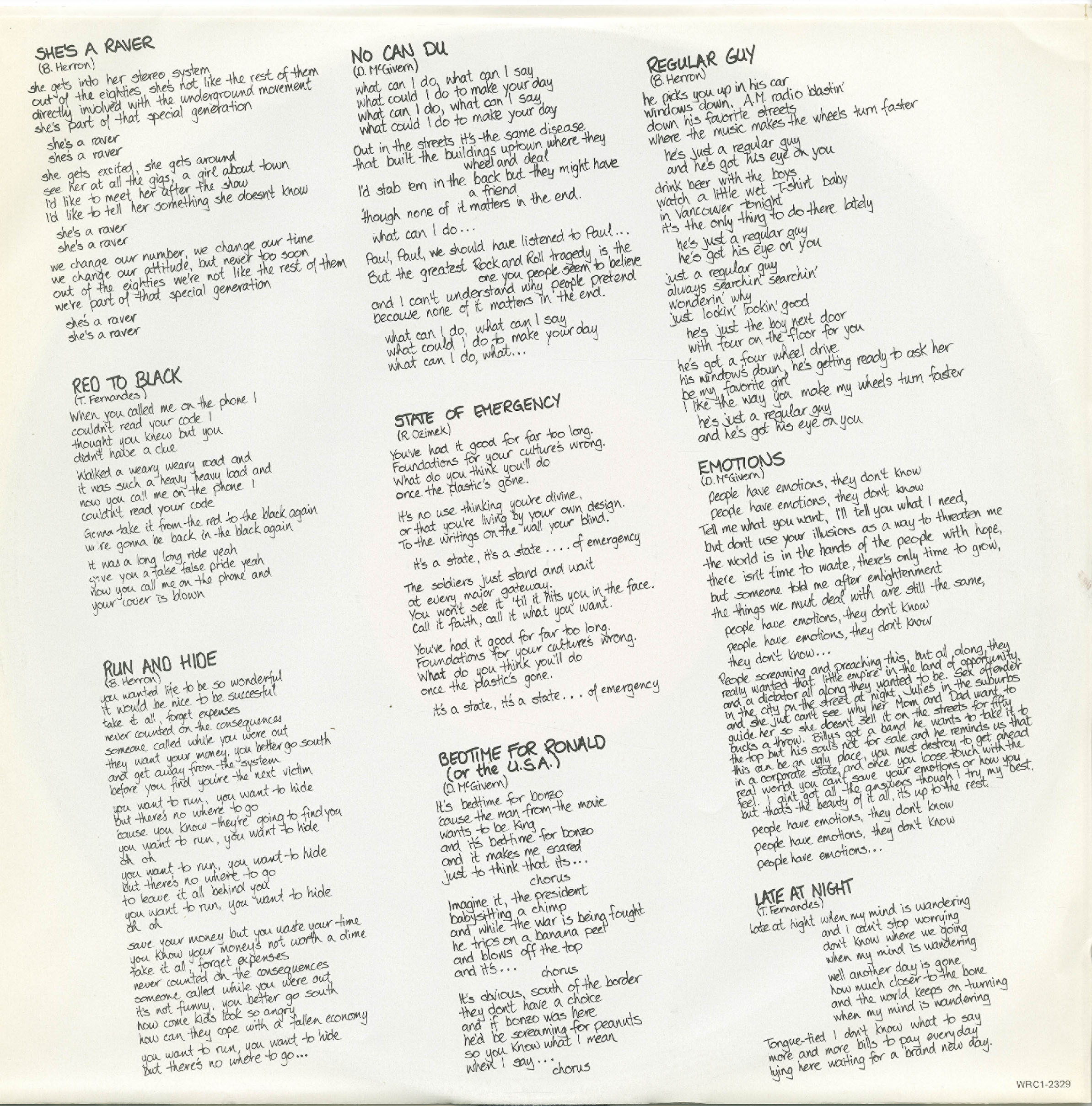 Their discography includes the politically-charged 7" Bedtime for Ronald (or the USA) (1980), the follow-up single Run and Hide b/w Late Night, and a full-length self-titled LP recorded at Blue Wave Sound Recorders and produced by Carlton Lee. While they often focused on original songs, their live repertoire also included smart, dancefloor-ready takes on Desmond Dekker, The Rude Boys, and The Doors—with lyrics bent to fit their sly worldview.