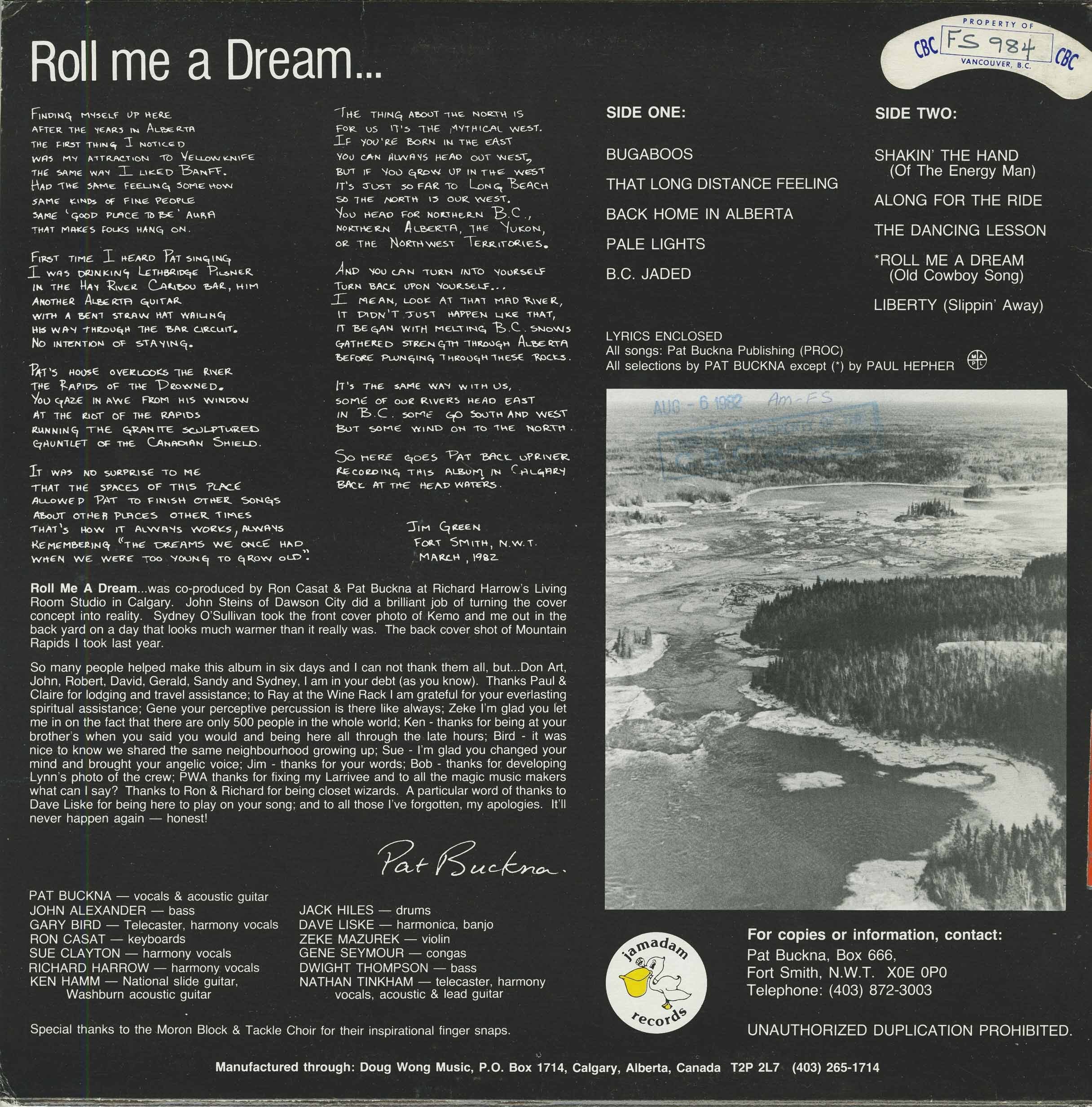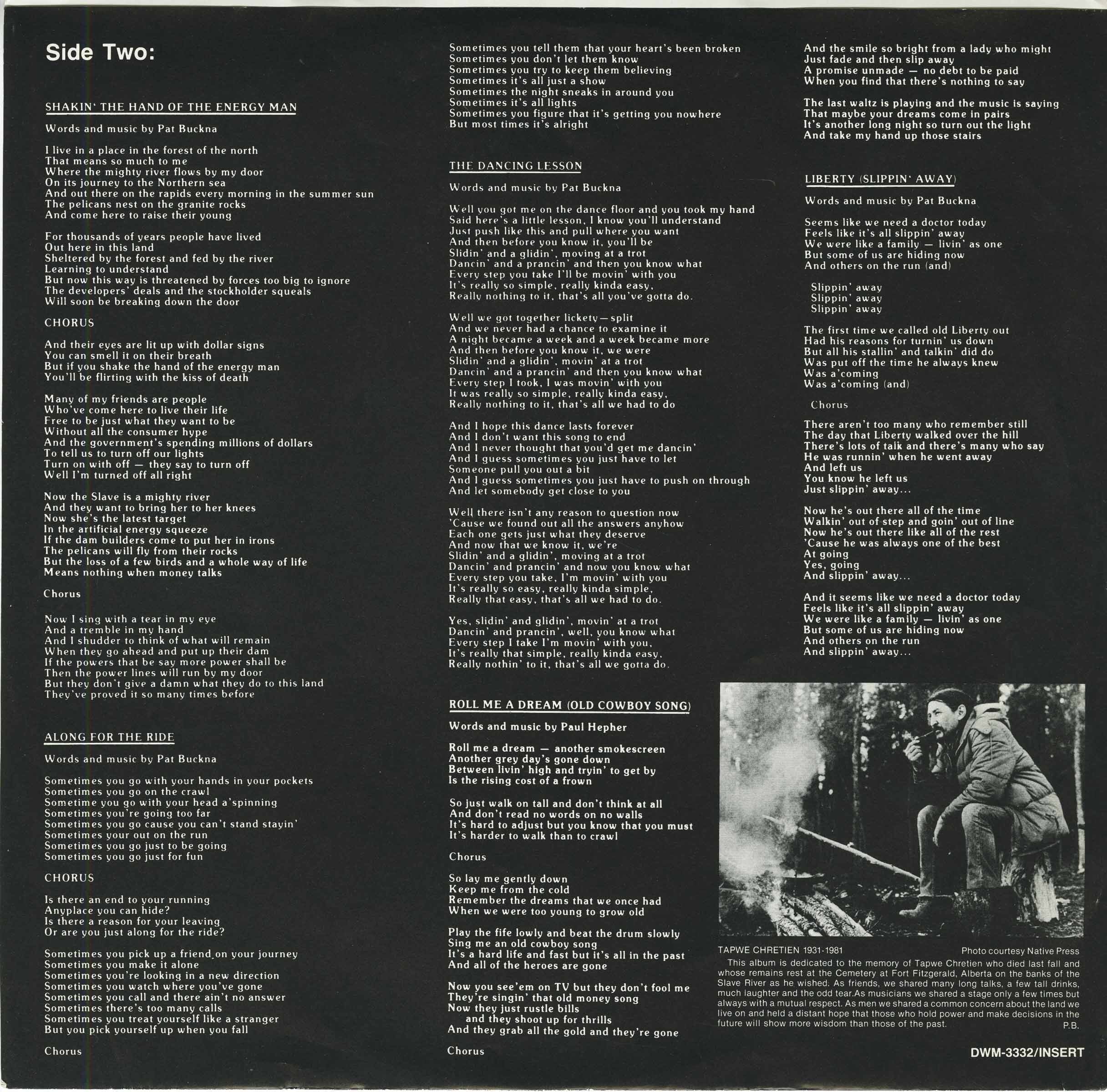 In the spring of 1982, I flew several musical friends, including my old conga player and friend, Gene Seymour - whom I'd convinced to move to Fort Smith the year before), John Alexander (from Yellowknife), Natham Tinkham, and Zeke Mazurek (fiddler with Sneezy Waters and Stringband) to Calgary to record the album. We were joined there by Dave Liske on harmonica, Sue Clayton on vocals, Ron Casat on keyboards, Ken Hamm on dobro and guitar, Dwight Thompson on bass and Jack Hiles on drums. The sessions took place over a week at Richard Harrow's LivingRoom Studios and the album was released June 21, 1983 - the opening day of the 3rd Folk on the Rocks festival. (Update: Oct. 2010 - Zeke Mazurek passed away after battling cancer - he will be missed by many of us.)