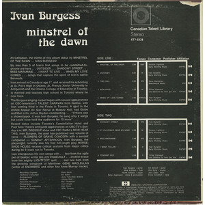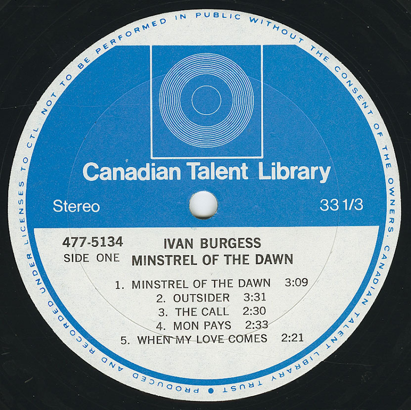 In 1970, Burgess recorded Minstrel of the Dawn for the Canadian Talent Library. This album was historic, marking the first fully Canadian-content LP released by the label.