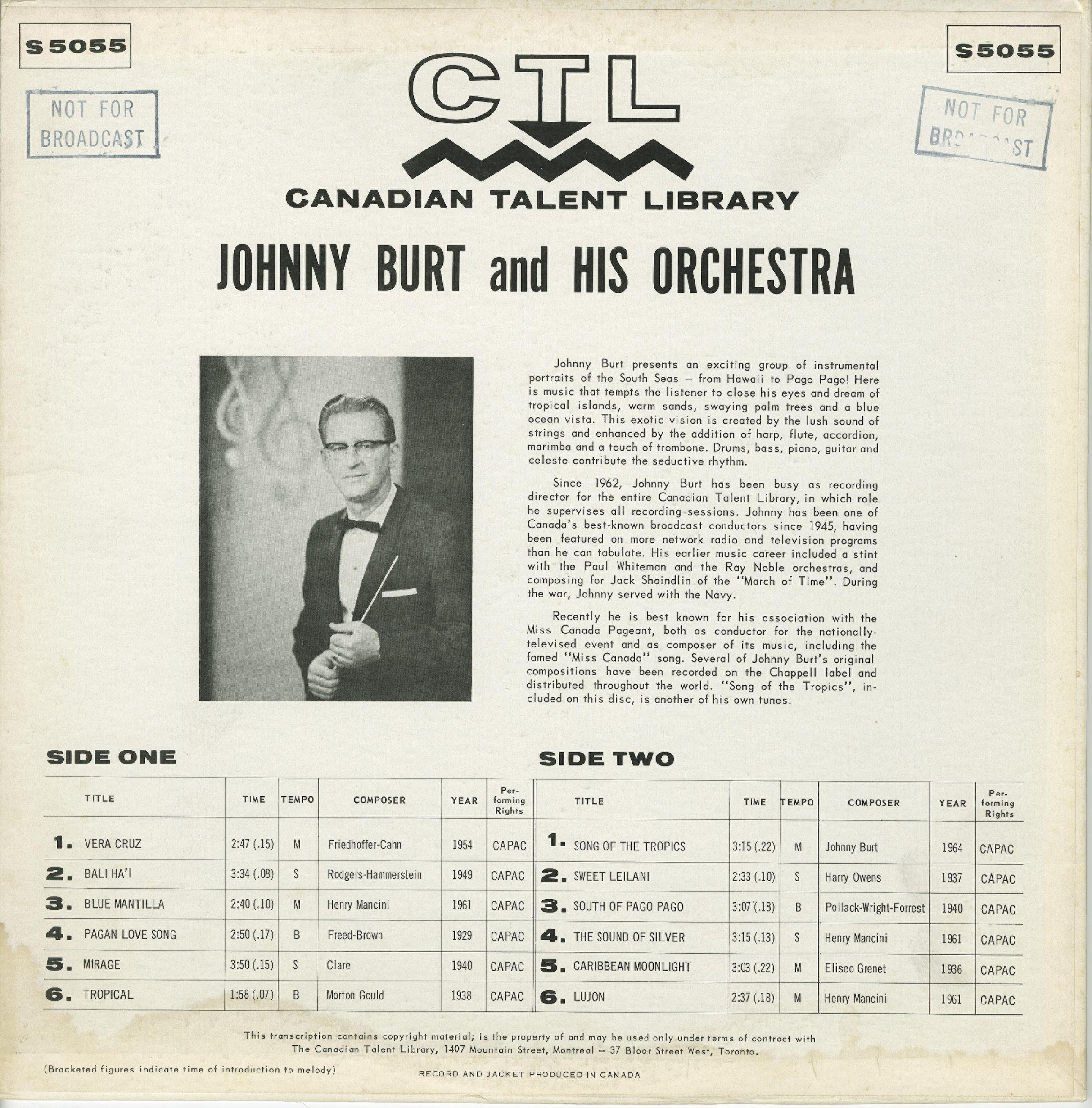 In 1962, Burt was appointed music director of the Canadian Talent Library (CTL), a role he held for a decade. He supervised recordings for dozens of Canadian artists and made numerous LPs of his own. These included his debut Trombone (CTL 5004), Reminiscing (CTL 5014), and Song of the Tropics (CTL 5055), all showcasing his signature blend of lush string writing, jazz-inspired rhythm sections, and tasteful piano work. Trombonist Teddy Roderman was featured prominently on several of these records, including Trombone and Reminiscing, with Burt contributing original compositions like “Theme for Susan” and “Mike Fright.”