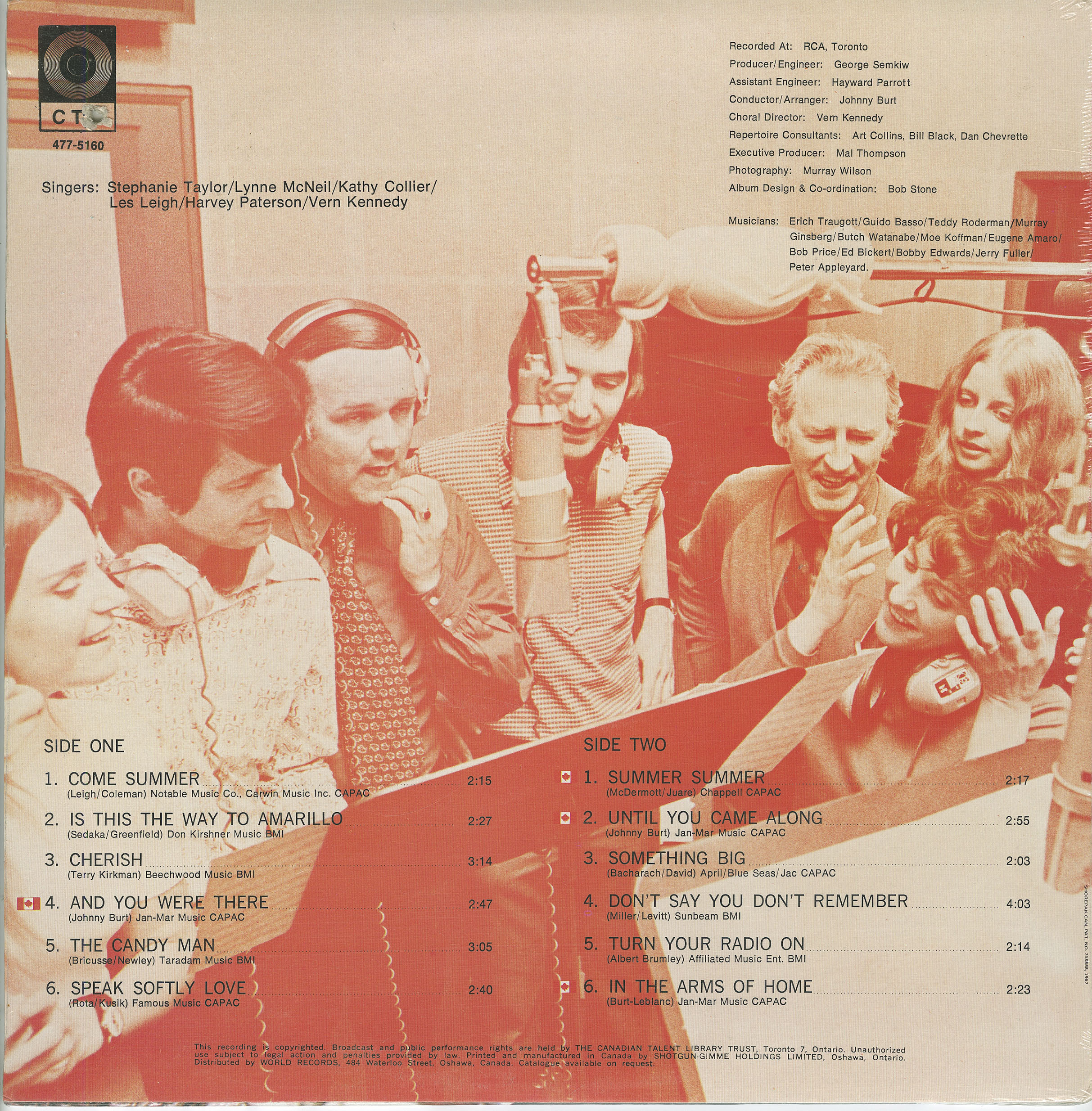 In 1972, Burt released one of his most distinctive albums under the name The Johnny Burt Society: …Come Summer (CTL 5160), a sunshine pop/jazz vocal LP featuring six singers (Stephanie Taylor, Lynne McNeil, Kathy Collier, Les Leigh, Harvey Paterson, and Vern Kennedy) and a studio orchestra that included Moe Koffman, Ed Bickert, Peter Appleyard, Guido Basso, and Eugene Amaro. The record offered sparkling renditions of contemporary hits like “Cherish,” “The Candy Man,” and “Speak Softly Love,” and remains one of the rarest and most sought-after releases in the CTL catalog.