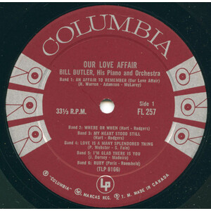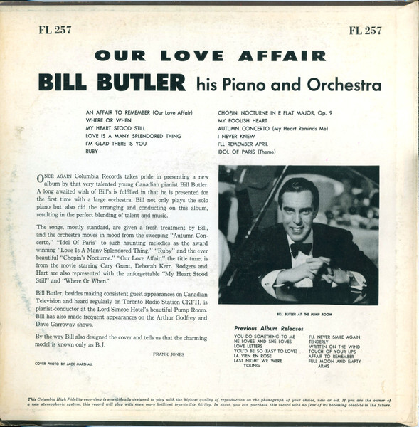ONCE AGAIN Columbia Records takes pride in presenting a new album by that very talented young Canadian pianist Bill Butler. A long awaited wish of Bill’s is fulfilled in that he is presented for the first time with a large orchestra. Bill not only plays the solo piano but also did the arranging and conducting on this album, resulting in the perfect blending of talent and music.