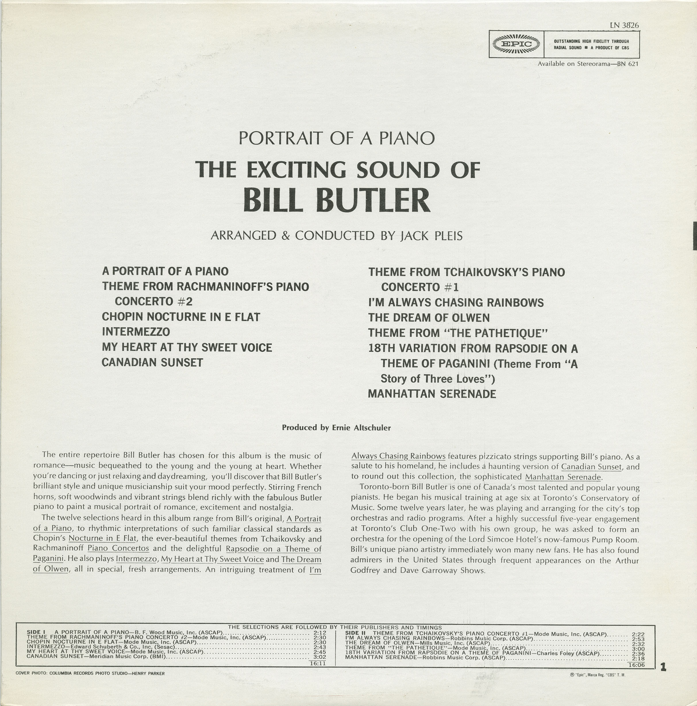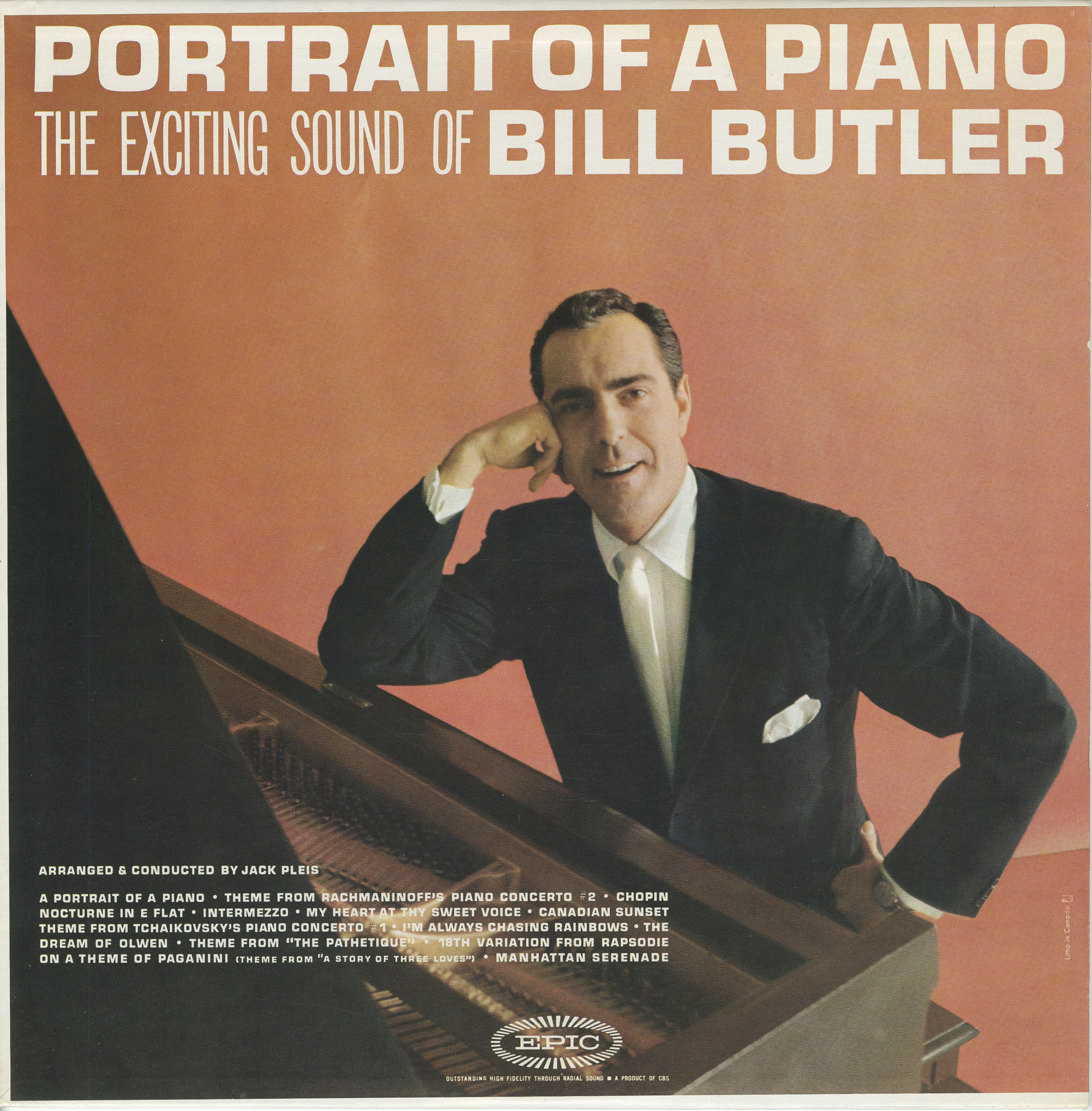 The twelve selections heard in this album range from Bill’s original, A Portrait of a Piano, to rhythmic interpretations of such familiar classical standards as Chopin’s Nocturne in E Flat, the ever-beautiful themes from Tchaikovsky and Rachmaninoff Piano Concertos, and the delightful Rapsodie on a Theme of Paganini. He also plays Intermezzo, My Heart at Thy Sweet Voice, and The Dream of Olwen, all in special, fresh arrangements. An intriguing treatment of I’m Always Chasing Rainbows features pizzicato strings supporting Bill’s piano. As a salute to his homeland, he includes a haunting version of Canadian Sunset, and to round out this collection, the sophisticated Manhattan Serenade.