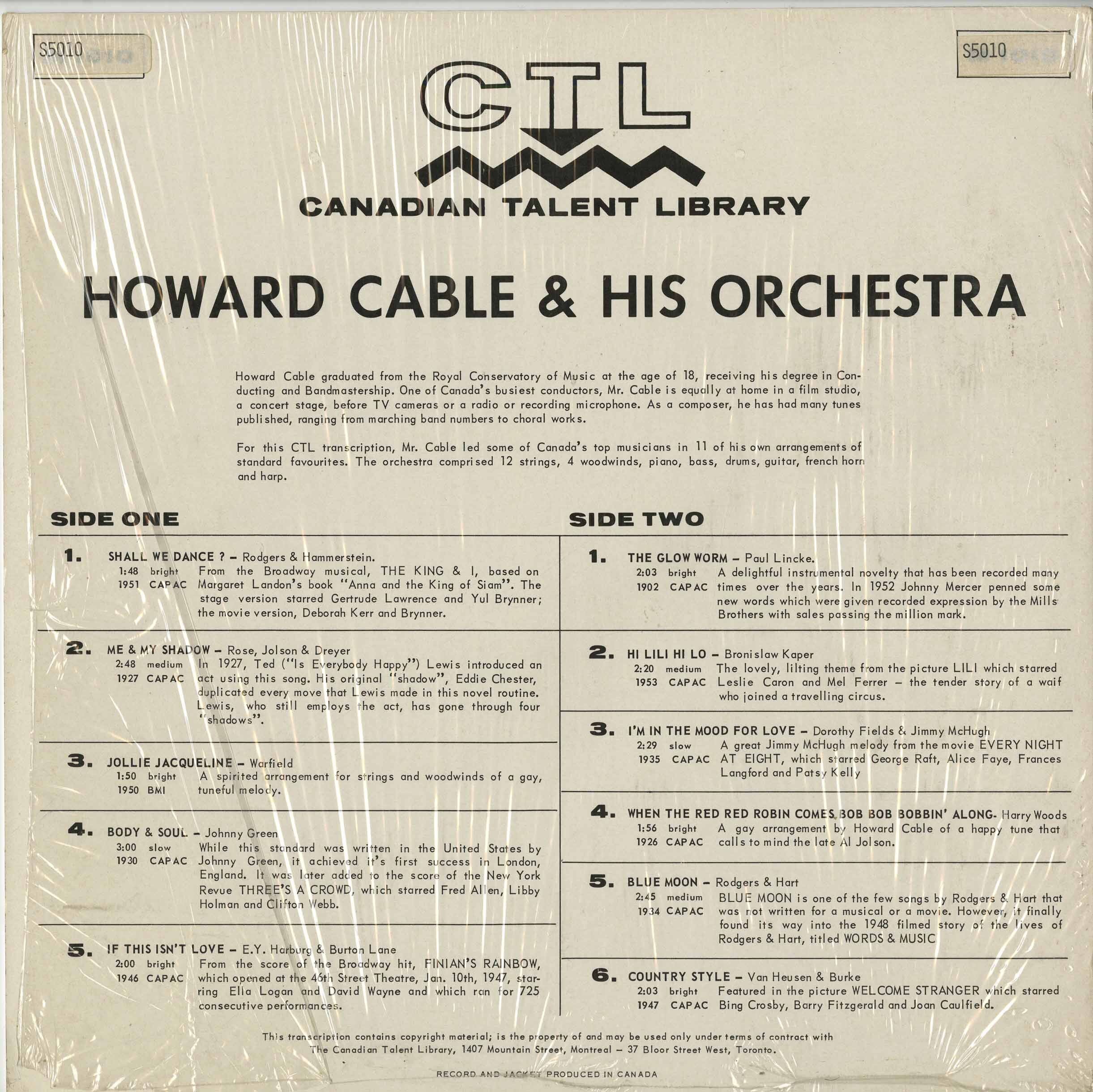 For this CTL transcription, Mr. Cable led some of Canada’s top musicians in 11 of his own arrangements of standard favourites. The orchestra comprised 12 strings, 4 woodwinds, piano, bass, drums, guitar, French horn and harp.