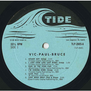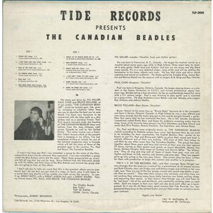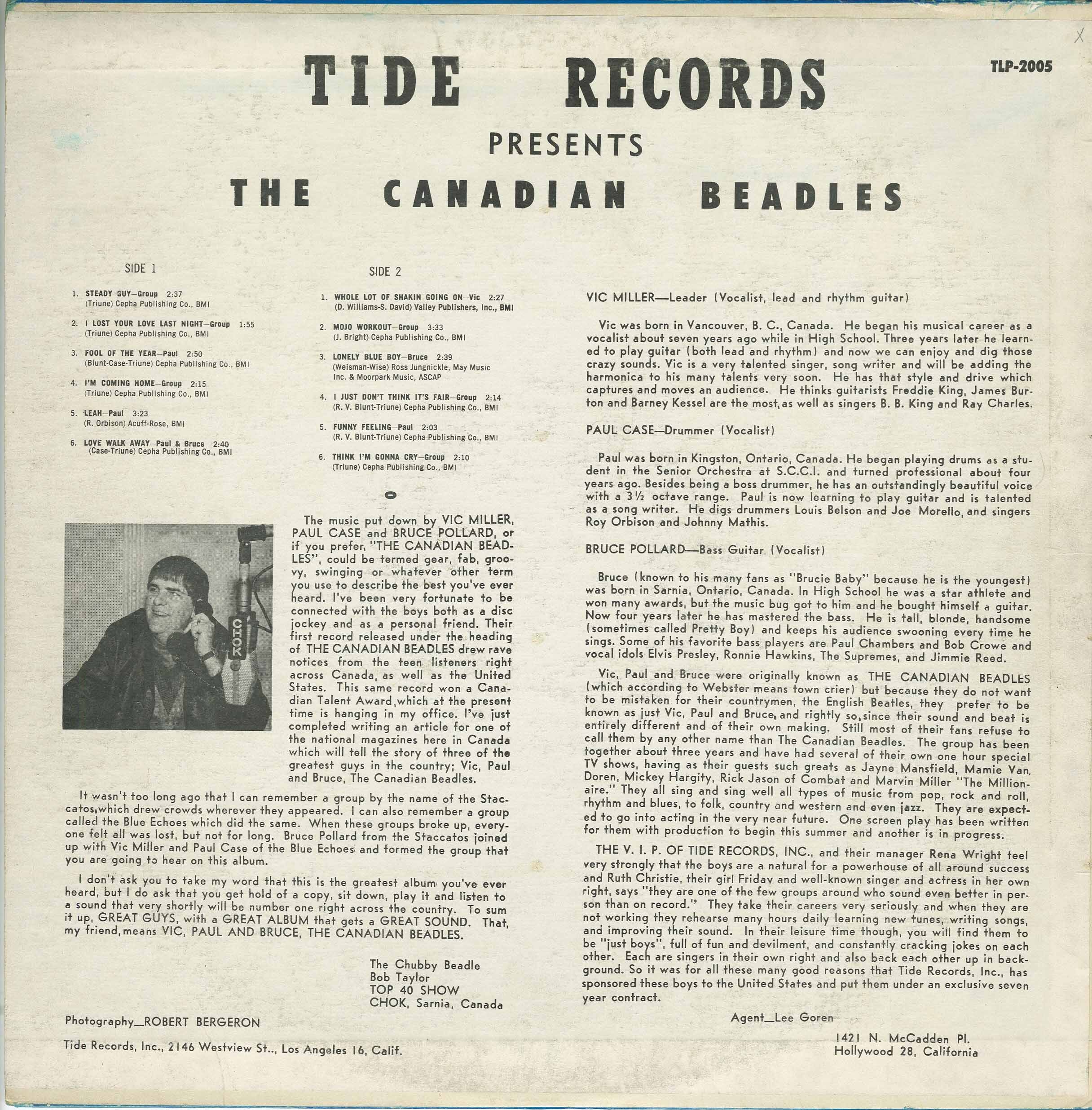 Here's a rare novelty one-off lp from the Canadian Beadles, who formed in Sarnia, Ontario in 1961. This album was released in 1964 on the tiny Los Angeles Tide label (Tide TLP-2005). The members of the band were Vic Miller, from Vancouver B.C., Paul Case from Kingston, Ontario and Bruce Pollard (aka Brucie Baby or Pretty Boy) who hails from Sarnia, Ontario. Bruce Pollard was formerly with the Staccatos and joined up with Vic and Paul of the Blue Echoes to form the Canadian Beadles. Later on, they would record a few 45's together as Vic, Paul & Bruce on the Quality and Tide labels. Most of the tracks are originals by the Canadian Beadles with a few remakes.