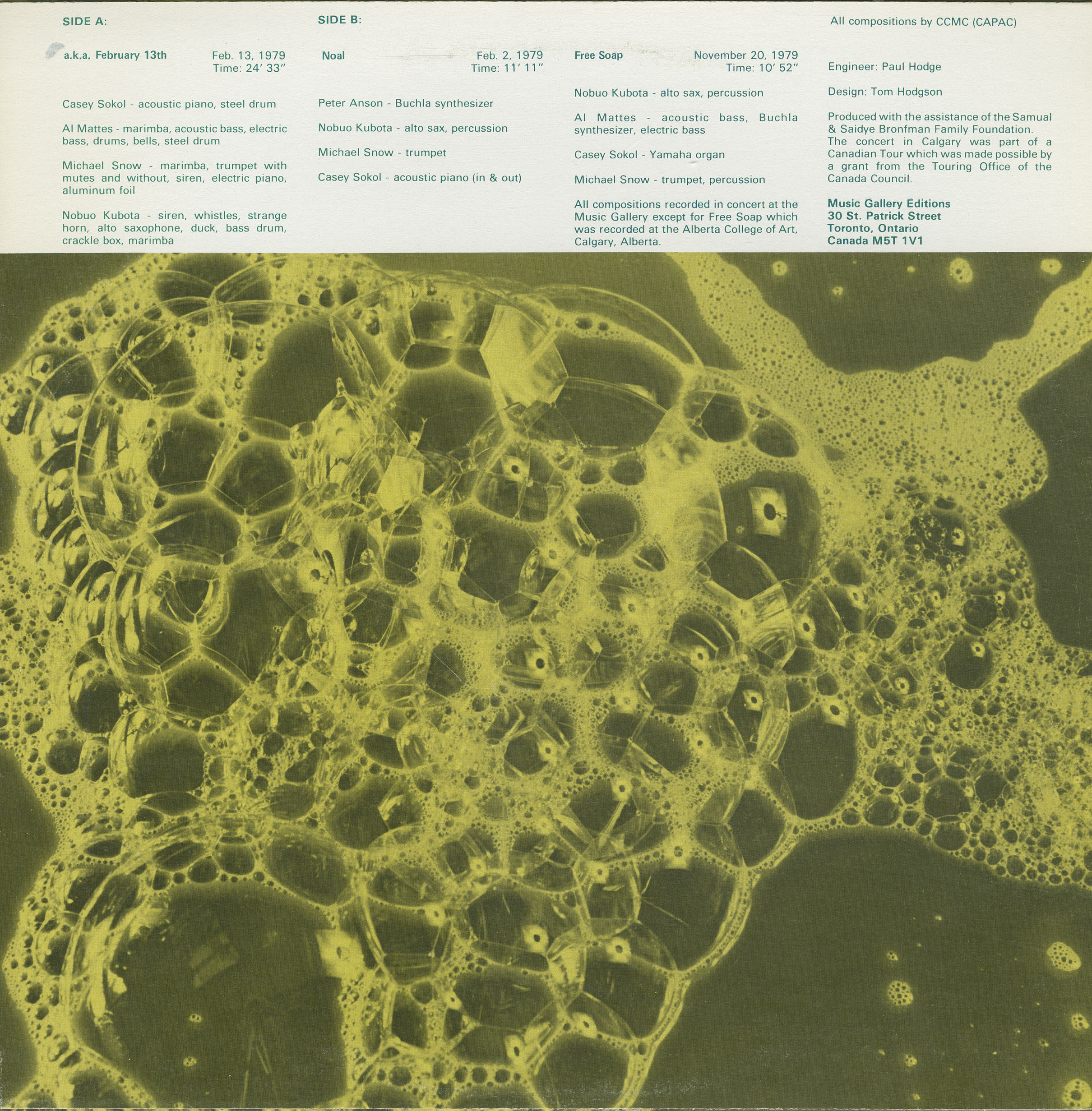 All compositions recorded in concert at the Music Gallery, except Free Soap, which was recorded at the Alberta College of Art, Calgary, Alberta