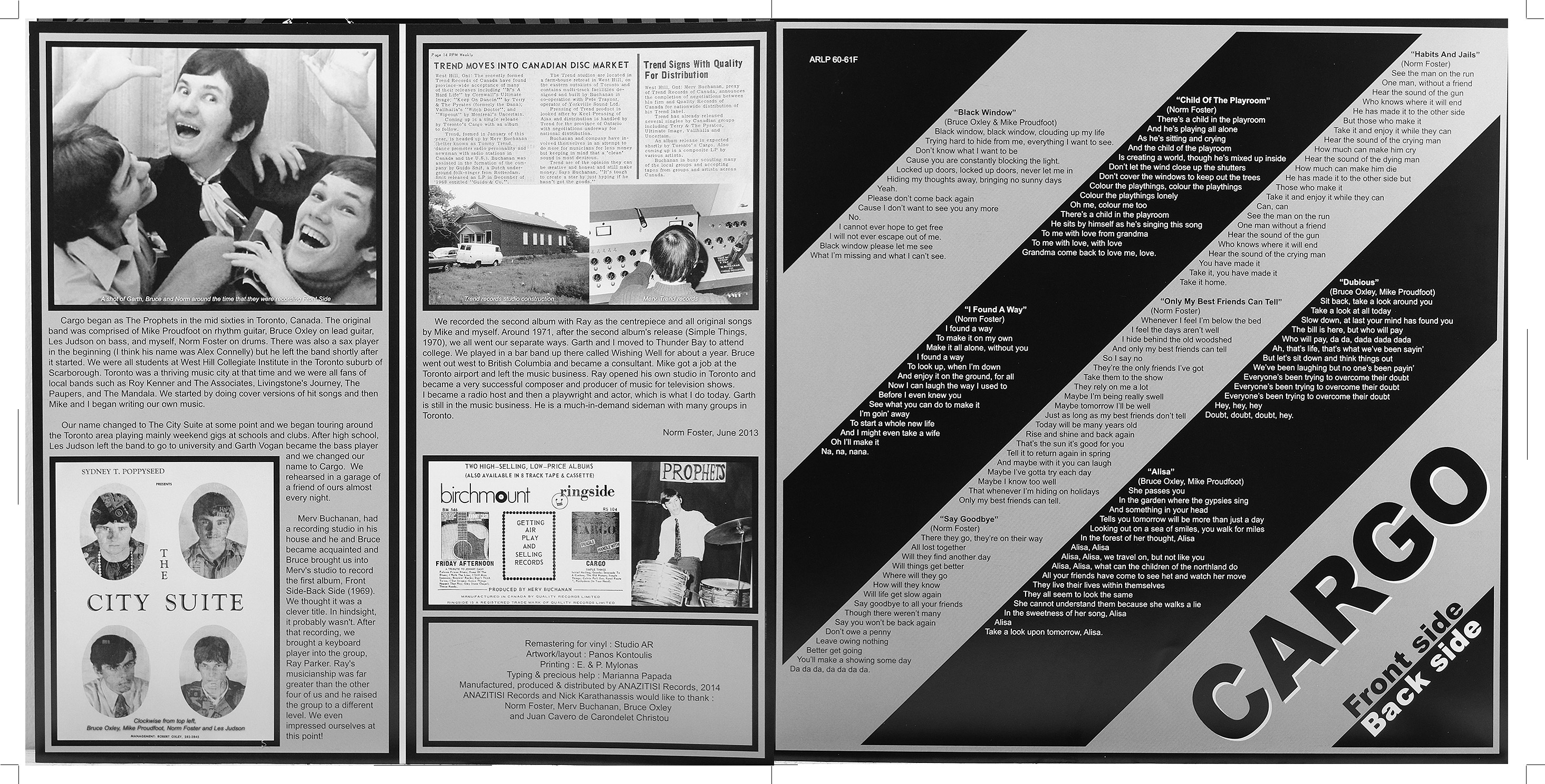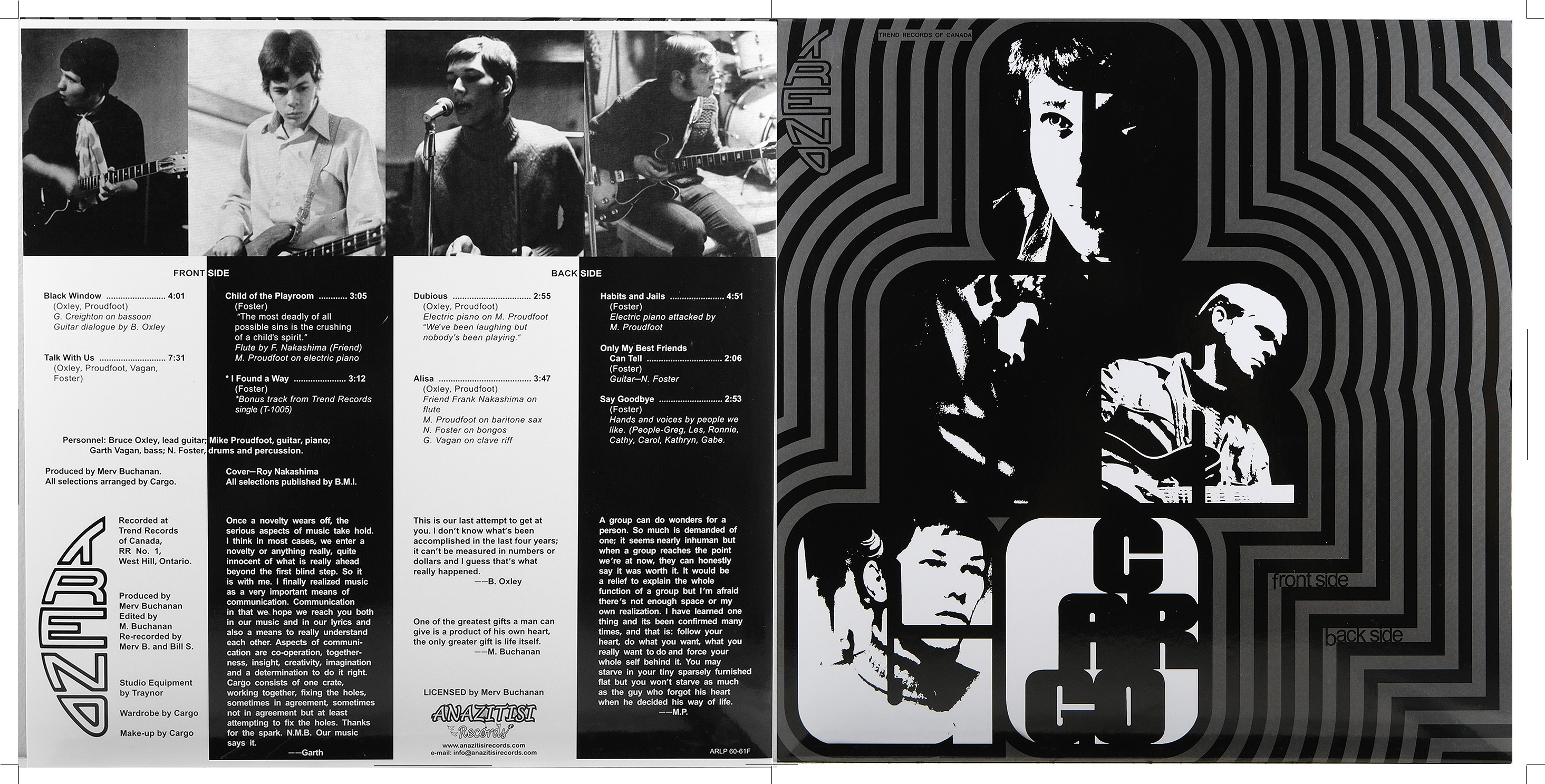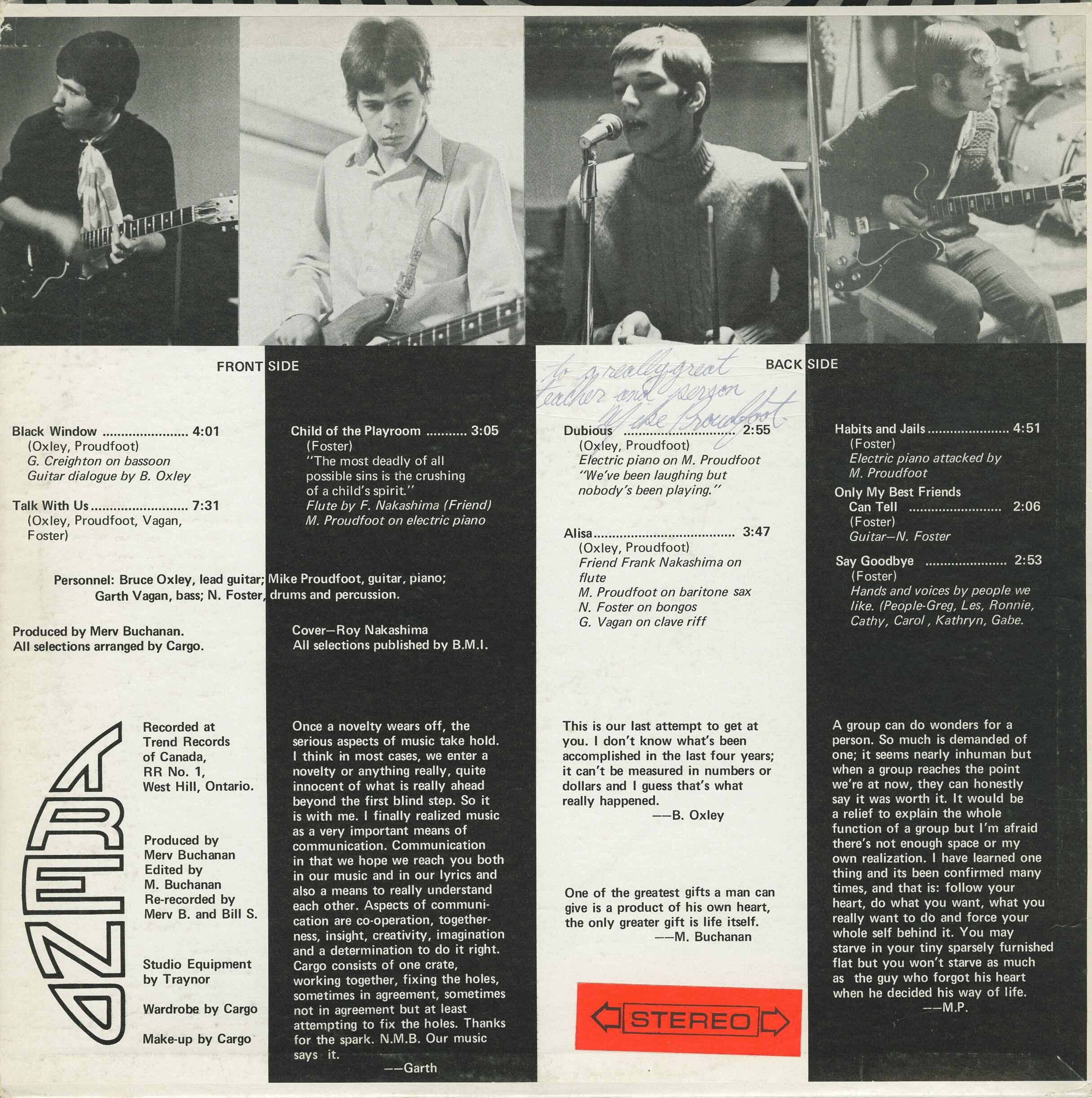tracks and credits: Black Window (Oxley, Proudfoot. G. Creighton on bassoon. Guitar dialogue by B. Oxley)/ Talk With Us (Oxley, Proudfoot, Vagan, Foster)/ Child of the Playroom (Foster)"The most deadly of all possible sins is the crushing of a child's spirit". Flute by F. Nakashima (Friend). M Proudfoot on electric piano // Dubious (Oxley, Proudfoot) Electric piano on M. Proudfoot. "We;ve been laughing but nobody's been playing"/ Alisa (Oxley, Proudfoot). Friend Frank Nakashima on flute. M. Proudfoot on baritone sax. N. Foster on bongos. G. Vagan on clave riff/ Habits and Jails (Foster). Electric piano attacked by M. Proudfoot/ Only My Best Friends Can Tell (Foster). Guitar-N. Foster/ Say Goodbye (Foster). Hands and voices by people we like. (People-Greg, Les, Ronnie, Cathy, Carol, Kathryn, Gabe).