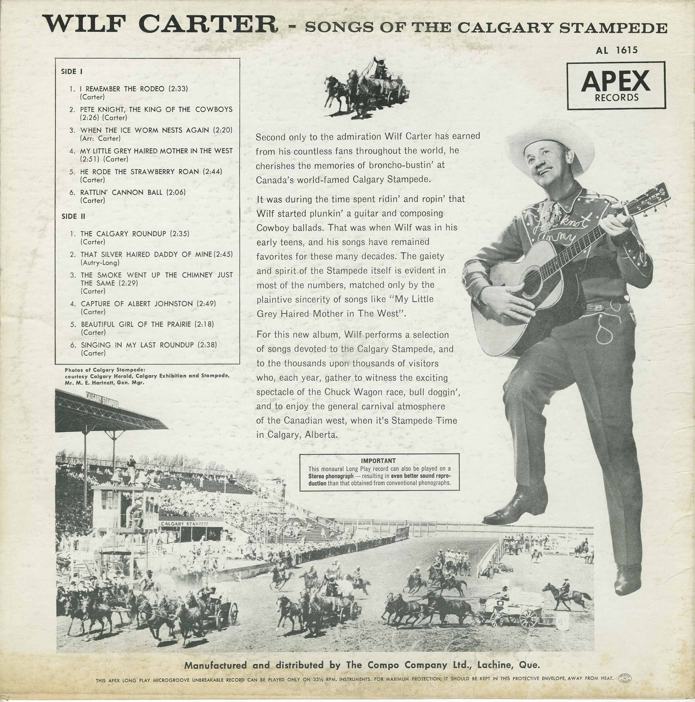 Born in Port Hilsford, Nova Scotia, Wilf Carter moved to Calgary, Alberta in 1923 when he was 19 years old. He loved the cowboy culture and would often sing at the Calgary Stampede. He worked at the rodeo as an 'ear-downer'. "His job was to grapple the horse around the neck as it ran by and bite down on its ear until it stopped bucking." In 1929, he had a regular radio show called "The Old Timers" on CFCN. In 1937 he purchased a 320 acre ranch near the Spruce Meadows show jumping facility in Calgary, Alberta.