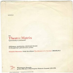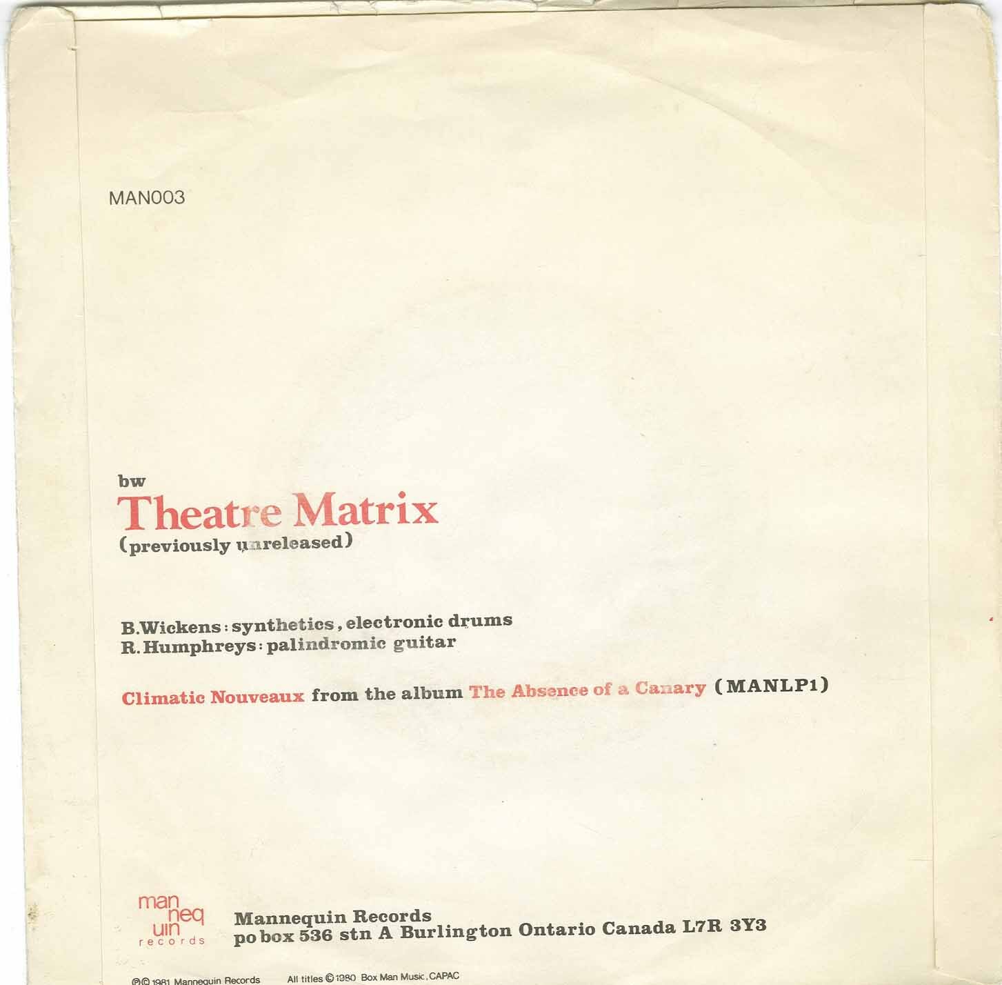 Electronic duo from Burlington, Ontario, were originally known as "The Jovial Foresters". The single with picture sleeve featured the previously unreleased version of Theatre Matrix. Brett Wickens was formerly with the band The Spoons and went on to design album artwork for artists such as Peter Gabriel, New Order, Joy Division, and Ultravox.