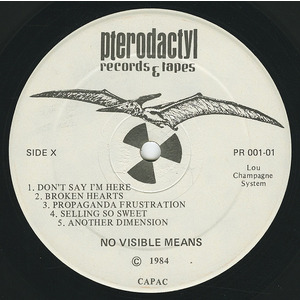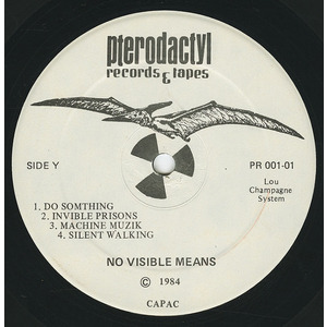 Canadian post-punk classic by one-man synth, guitar and syn-drum band, Lou Champagne System. 'No Visible Means' was privately pressed on Lou's Ontario-based Pterodactyl Records in 1983. Over nine tracks he serves an impressively diverse array of post-punk styles, from more jagged guitar-driven wave pop to slicker electronic disco with a slightly daft but endearing darkside lyrical rhetoric. It's the latter styles which make up the highlights, including one in particular 'Propoganda Frustration', a standout piece of arpeggiated disco bass and tortured vox with a shifty patina of dubbed-out guitar primed for the darkest dancefloors. Equally on a dry, motorik minimal tip, there's the excellent 'Silent Walking', while the rest tends towards spikier punk modes, like the propulsive guitar and rushing machine rhythm vectors of 'Another Dimension' and the snotty fury of 'Do Something'.