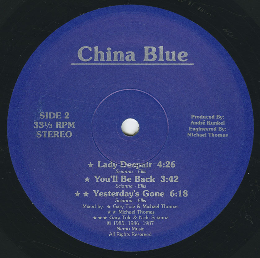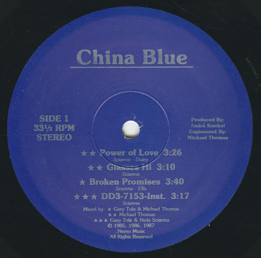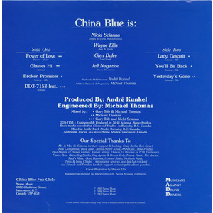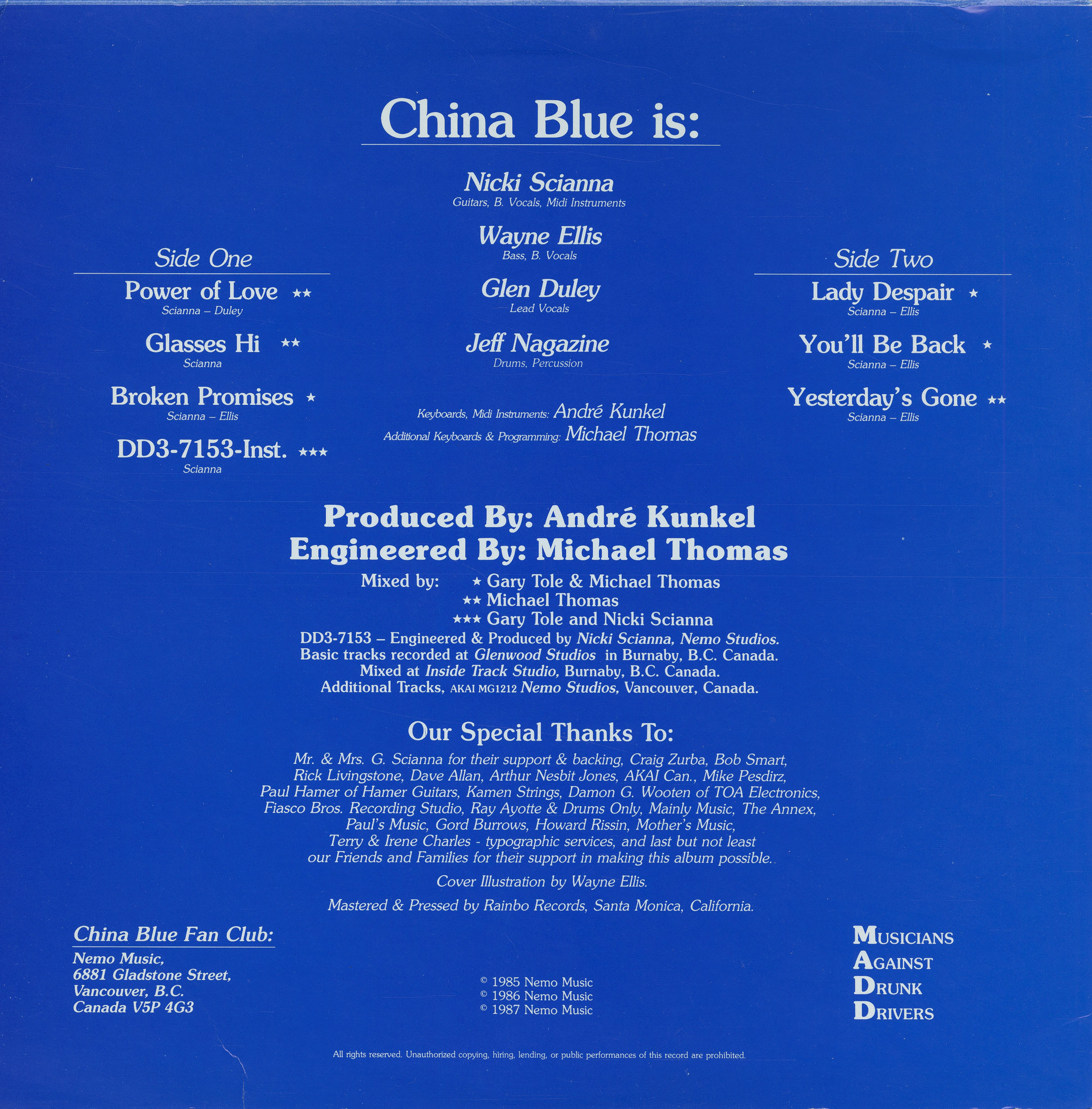 Their self-titled China Blue mini-album, released independently in 1987, remains the band’s definitive recorded statement—a seven-track collection of melodic hard rock marked by soaring vocals, thick synth textures, and tightly arranged guitar work. The album was recorded at Glenwood Studios in Burnaby and mixed at several Vancouver-area studios. It was produced and engineered by André Kunkel, with additional contributions from Michael Thomas, Nicki Scianna, and Gary Tole. Highlights include “Power of Love”, “Broken Promises”, and the emotionally driven “You’ll Be Back.”