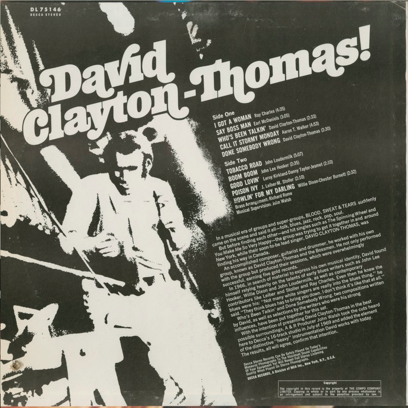 While BS&T was tearing up the charts, Clayton-Thomas continued his solo career, releasing his blues-tinged self-titled debut on Decca in 1969, featuring "I Got A Woman" by Ray Charles and the single, "Say Boss Man' b/w "Done Somebody Wrong," and covers of Willie Dixon's "Howling For My Darling," Leiber and Stoller's "Poison Ivy," and Jon Lee Hooker's "Boom Boom." Shortly later BS&T released their second Lp, self titled, featuring the monster hits "Spinning Wheel" and "You've Made Me So Very Happy."