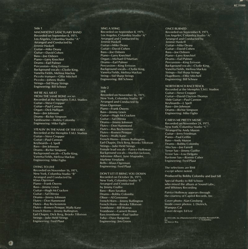 Bobby Colomby: drums ("Don't Let It Bring You Down" "Caress Me Pretty Music"); tambourine ("We're All Meat")