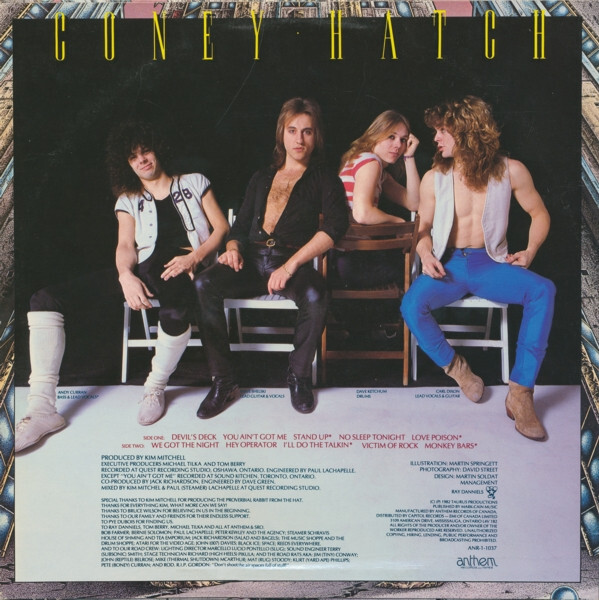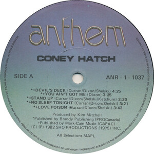 Coney Hatch, Coney Hatch's first album, was released in 1982. A video for the song "Devil's Deck" was produced. The album was re-issued by British label Rock Candy Records in 2005, including 3 bonus tracks and liner notes by former Kerrang! writer Howard Johnson.