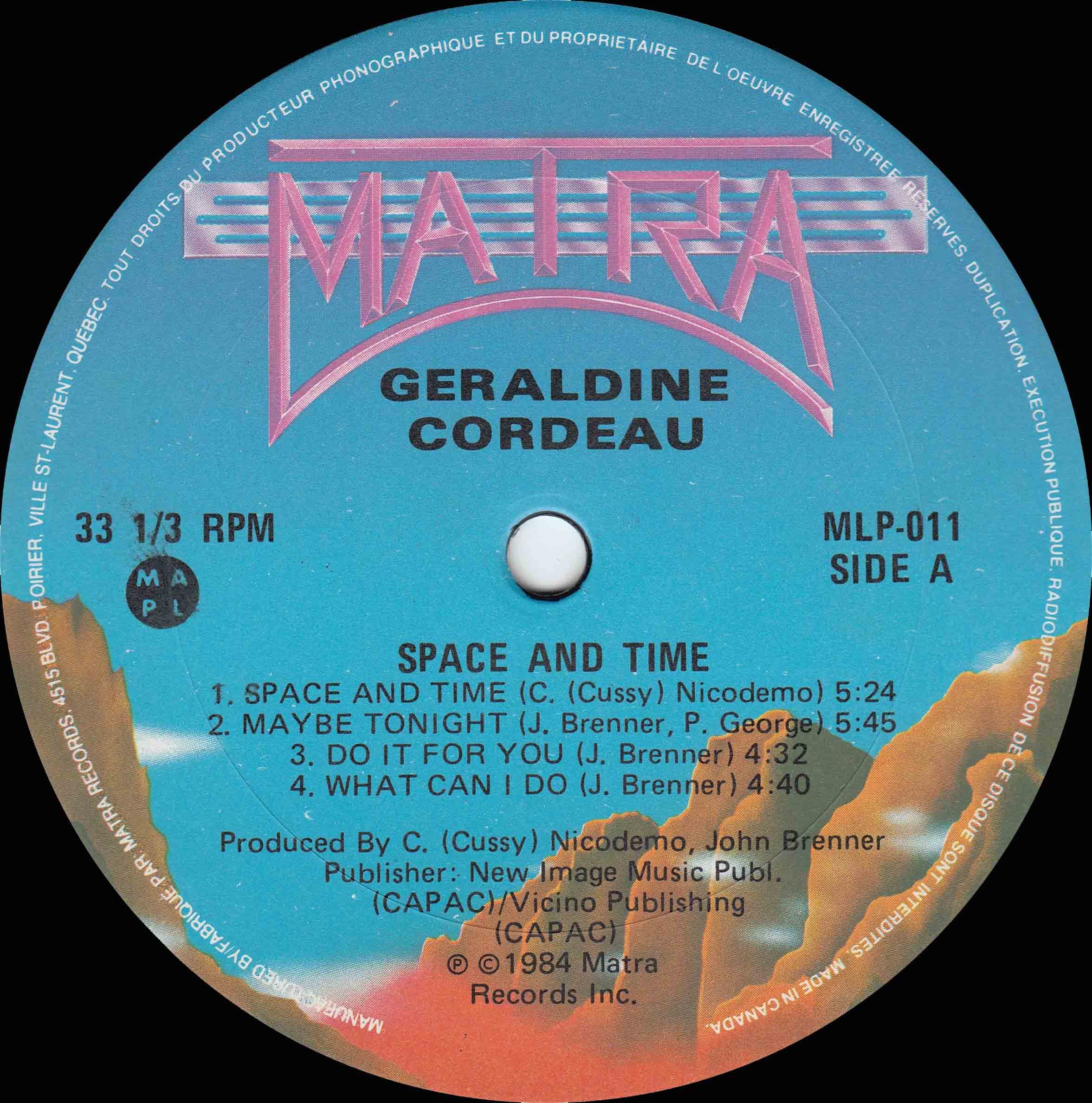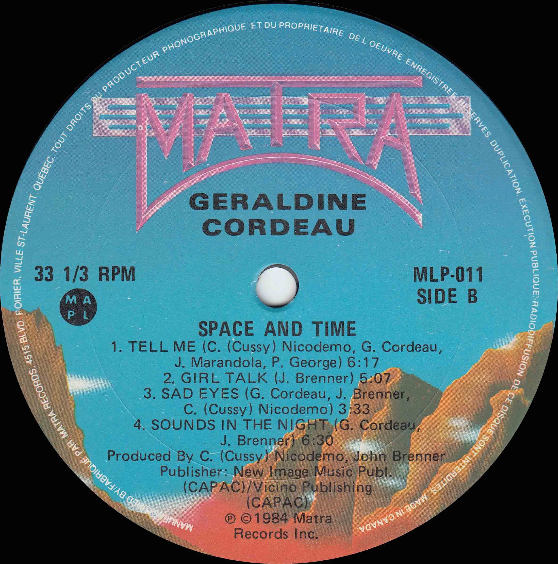 All of those sides fed naturally into her lone full-length album, Space and Time, released in 1984. The LP brought together eight tracks—cosmic, polished, and deeply rooted in the Montréal synth-disco aesthetic—arranged by her longtime collaborator John Brenner and produced by Brenner and C. “Cussy” Nicodemo. Cordeau sang all lead vocals, supported by a tight in-house cast that handled congas, drum overdubs, keyboards, and multiple layers of harmonies. Recorded at Ultrason Studio, with “Sounds in the Night” cut earlier at Mechanicland, the album blended Prophet-5 textures, vocoder shading, and dance-floor momentum into a cohesive atmosphere that made it one of Matra’s standout releases. It even earned a Gala de l’ADISQ nomination for Dance Album of the Year, placing her among Quebec’s top disco and dance artists of the time, and the LP later circulated in Spain under the bilingual title Espacio y Tiempo.