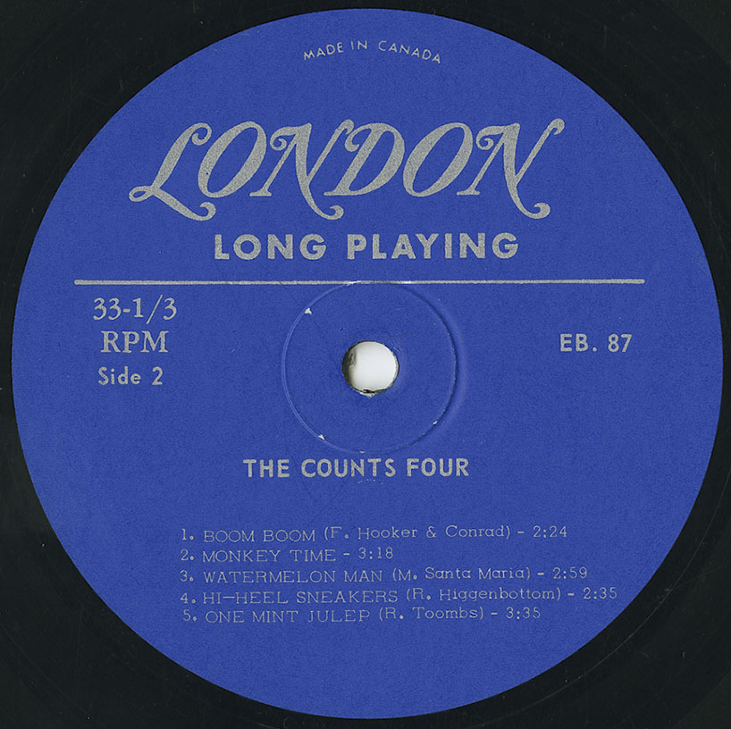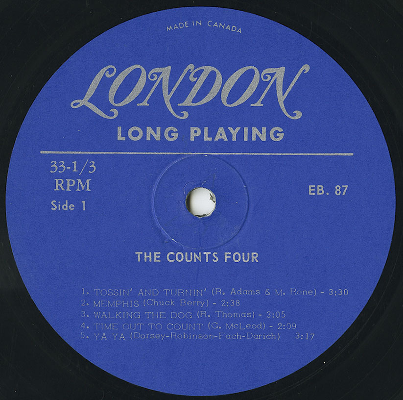 The Counts Four are a triple treat group: they play solos…duets…blues or rock n’ roll. This LP certainly shows that they have created their own special brand of driving music. Theirs has been a short but phenomenal career. From one night stands and school hops to top engagements throughout Canada and the United States all in the space of one year. Here are four young men with a big musical message who are going places…..but fast!