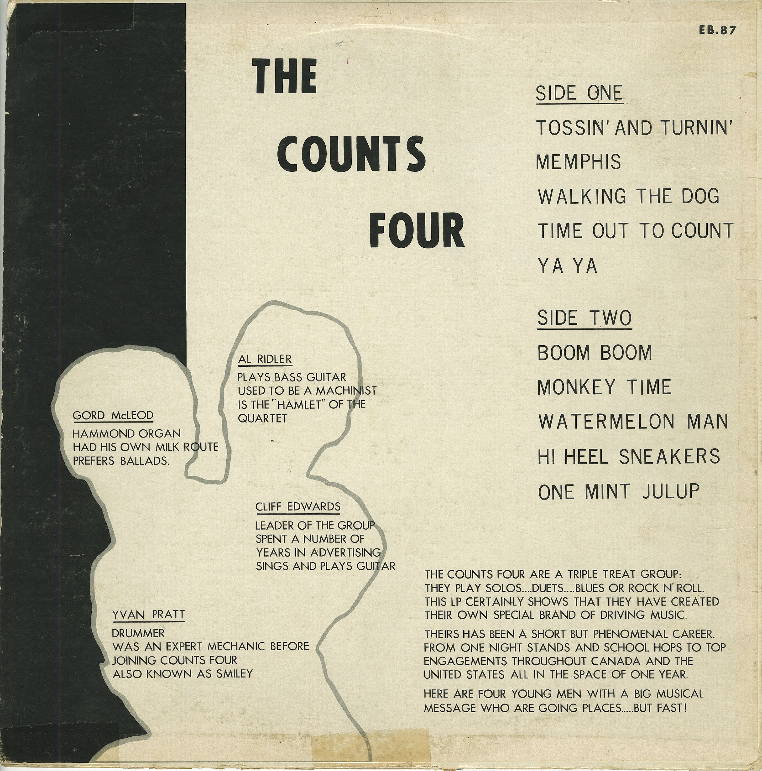 The lineup featured Cliff Edwards (vocals, guitar), Gord McLeod (Hammond organ), Al Ridler (bass), and Yvan Pratt (drums). The group’s self-titled LP captures a repertoire rooted firmly in the American R&B songbook, including “Boom Boom,” “Hi Heel Sneakers,” “Watermelon Man,” “Monkey Time,” and “Walking the Dog,” alongside Cliff Edwards’ original “Time Out to Count.” The record presents what the jacket proudly described as a “triple treat group” capable of solos, duets, blues, or straight rock ’n’ roll — a reflection of the era’s live dance-band versatility.