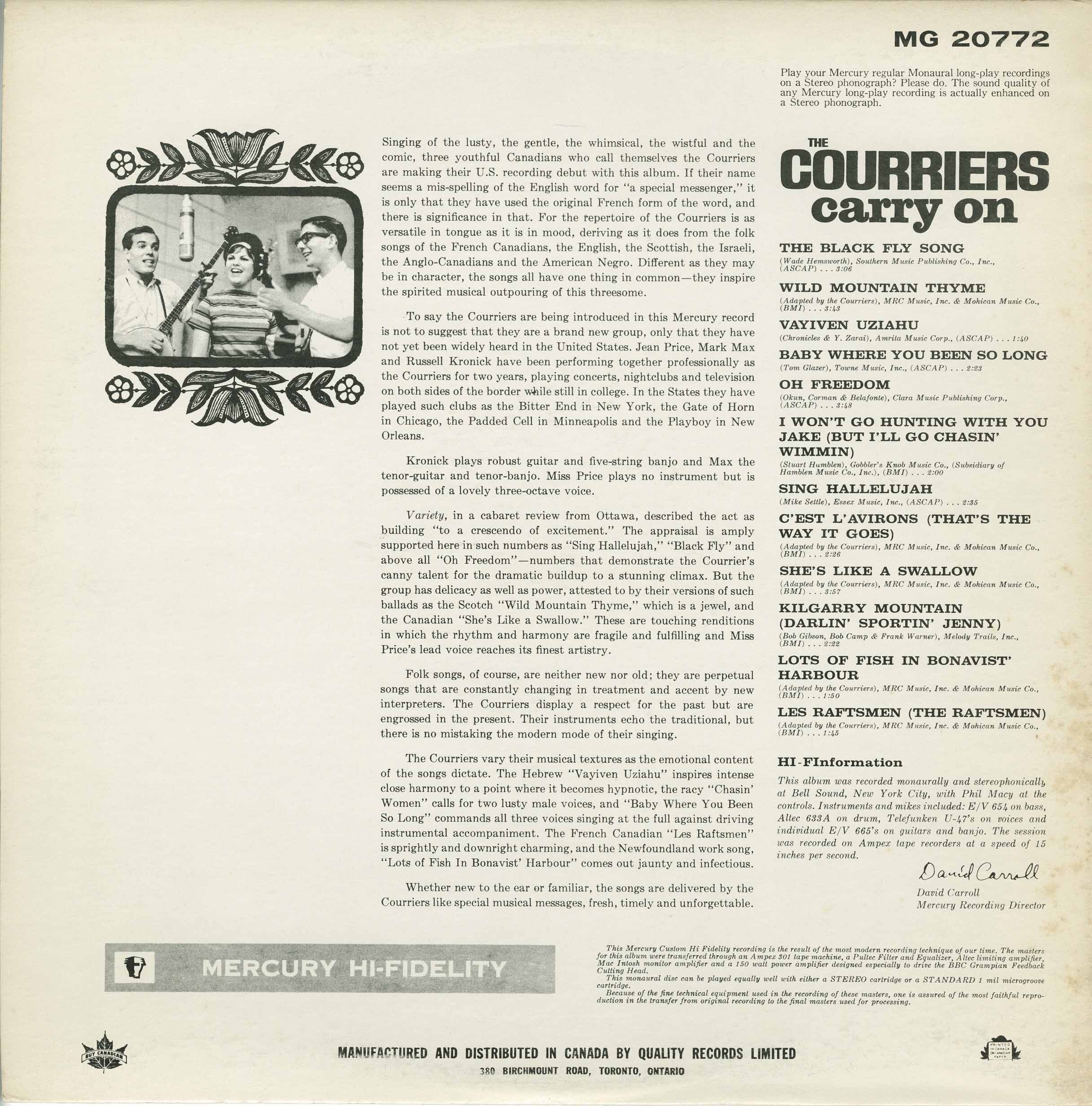 By 1961â62, management and bookings began pulling them beyond Ottawa into MontrĂŠal club work, U.S. college dates, and industry auditions in New York. When Mirsky left, the Courriers found a remarkable replacement in Jean Price, whose presence added a true ballad voice and expanded the groupâs range. With Price, the Courriers cut their debut album for Mercury, The Courriers Carry On (recorded in 1962; issued 1963), a high-energy set that moved confidently through traditional material, gospel, and international folk themes. It was the record that introduced many listeners to the groupâparticularly via âSing Hallelujahââand it remains their most celebrated and sought-after release, prized for its speed, clarity of diction, and âbuild to the climaxâ vocal arranging that made the trio sound larger than it was.