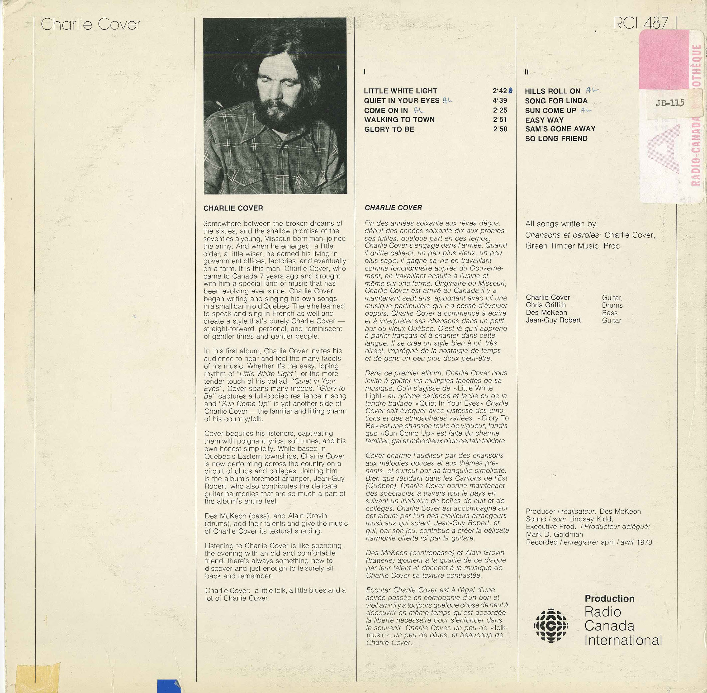 An Amercian (Missouri-born) troubadour, Charlie Cover settled in Québec's Eastern Townships near Montreal in the 70's, and was quickly adopted by Québecers and Canadians who heard him while he toured the small club circuit across the country.