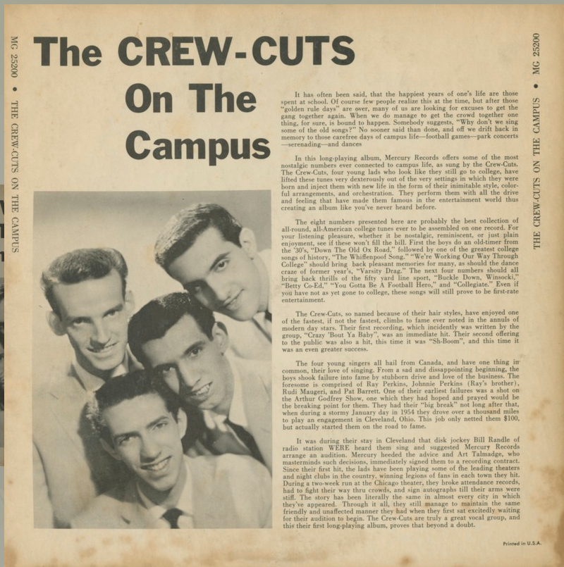 Beyond record sales, the Crew-Cuts were central to the sound of early television and radio variety programming. Their music captured a moment when vocal groups functioned as cultural translators—bridging jazz, pre-rock pop, and emerging youth sensibilities—while maintaining a distinctly professional, pan-North-American appeal. Though their success unfolded largely within the U.S. market, their roots and identity remained firmly Canadian, making them one of the earliest examples of a Canadian vocal group achieving sustained international visibility.
