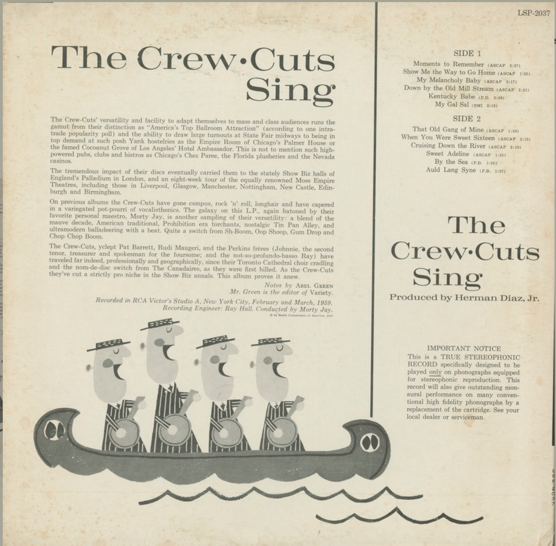 On previous albums the Crew-Cuts have gone ramps, rock ’n’ roll, longhair and have capered in a variegated pot-pourri of vocalisticism. The galaxy on this LP, again balanced by their favorite personal maestro, Morty Jay, is another sampling of their versatility: a blend of the mauve decade, American traditional, Prohibition era torchants, nostalgic Tin Pan Alley, and ultra-modern balladering with a beat. Quite a switch from Sh-Boom, Oop-Shoop, Gum Drop and Chop Chop Boom.