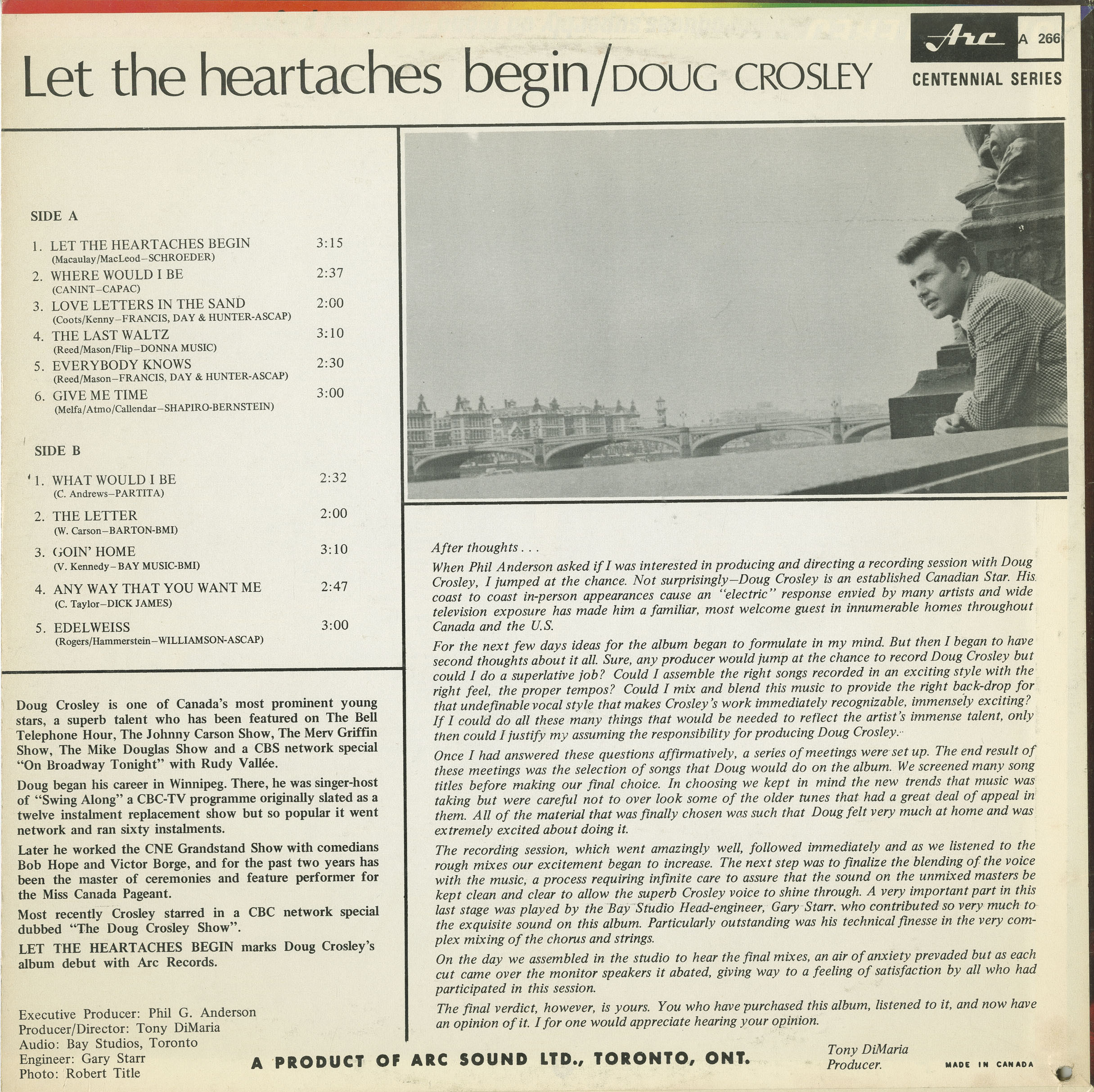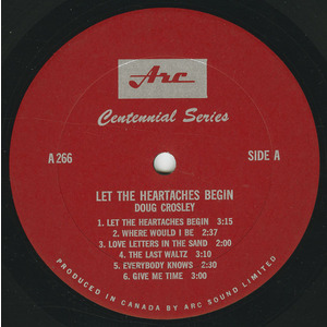 Crosley’s breakthrough in the U.S. came when he performed on The Bell Telephone Hour at the Brooklyn Theatre in New York City. This exposure led to a recording contract with RCA Victor, and in 1965 he released his debut LP New Star in Town, arranged by Jack Pleis, Charles Fox, and Marty Manning. The album showcased his romantic balladeer style and featured a blend of contemporary pop and American standards. His follow-up album, Let the Heartaches Begin (Arc AS 266), was released as part of the Arc Centennial Series and featured renditions of contemporary hits and originals.