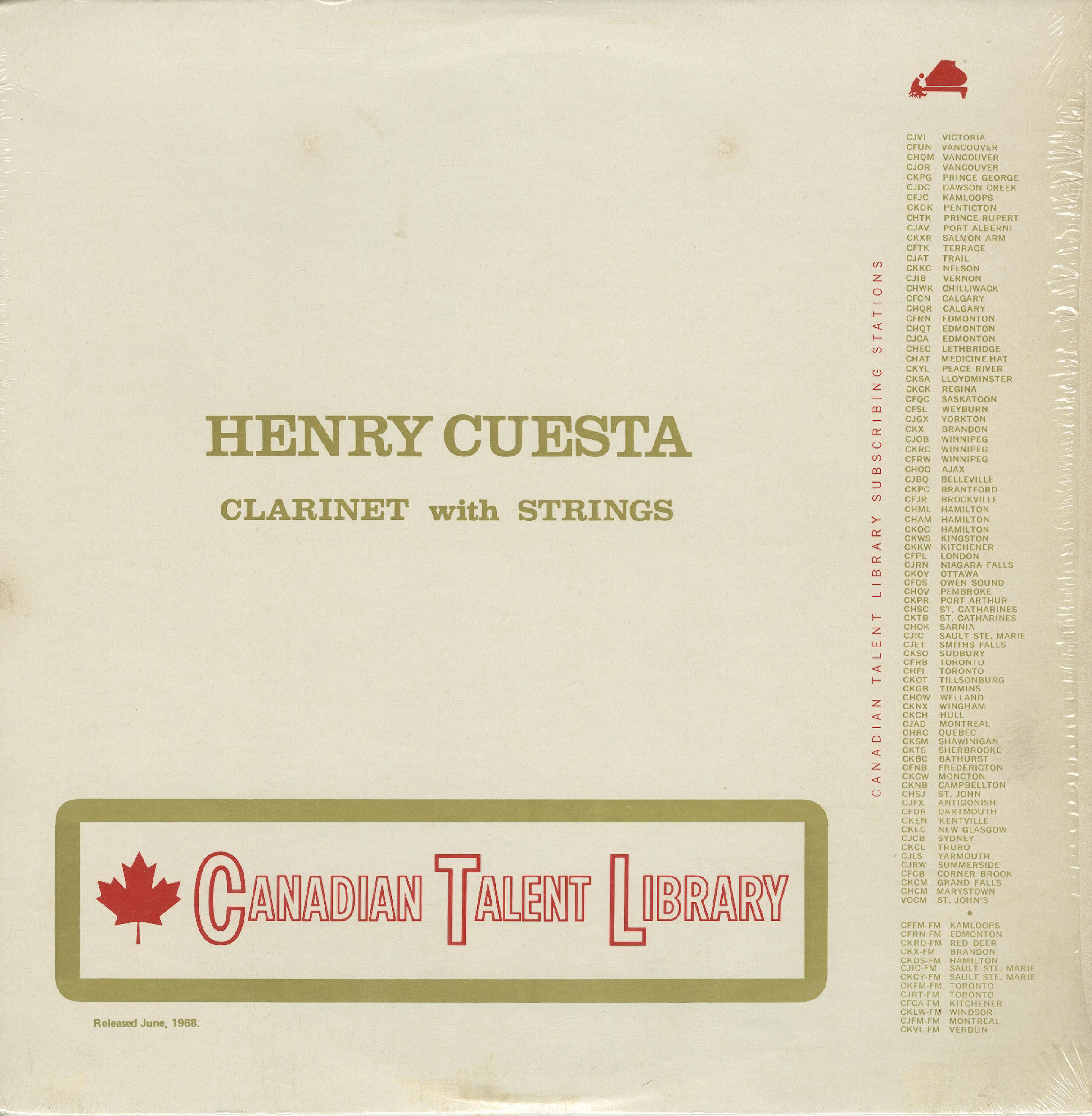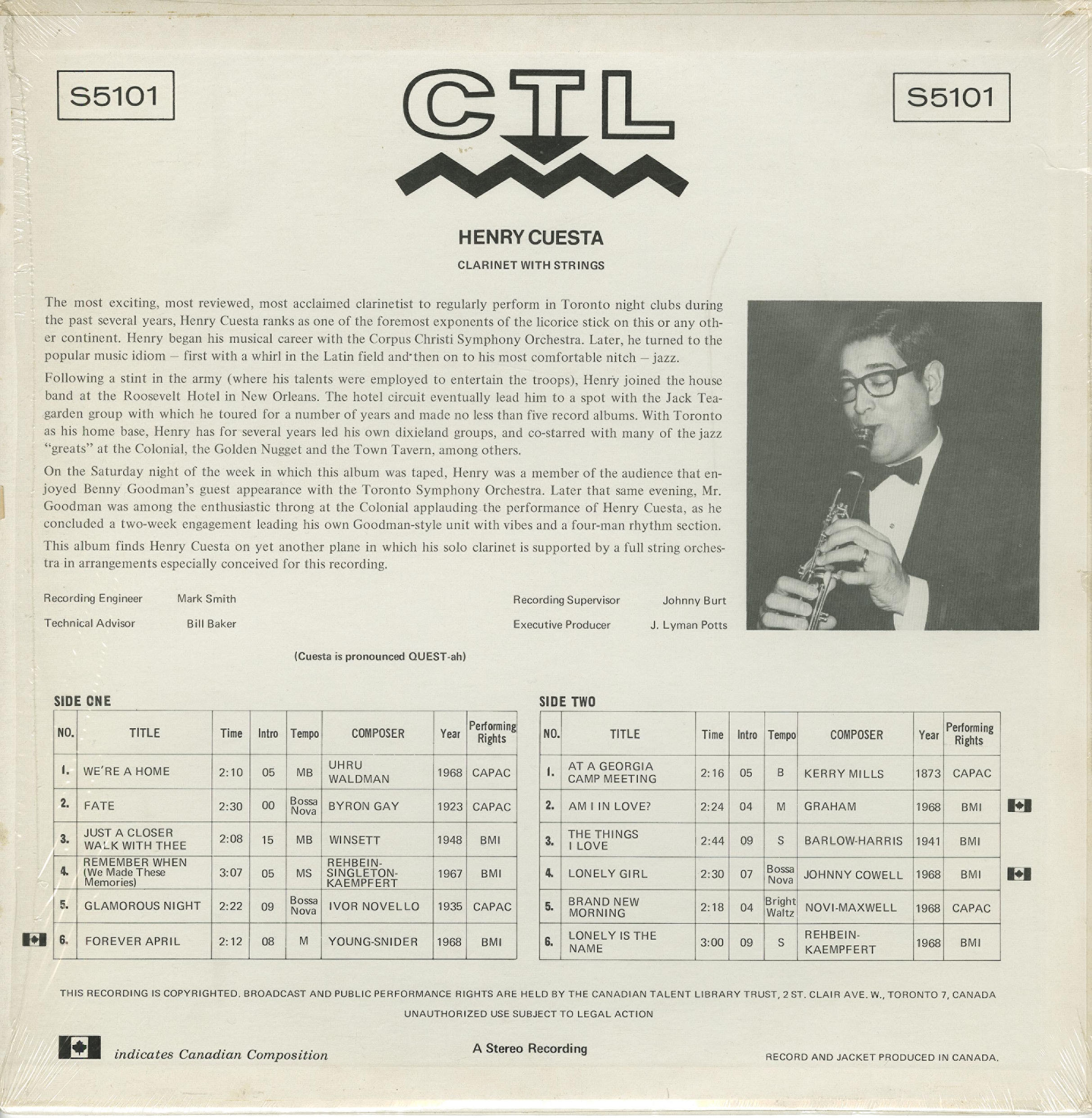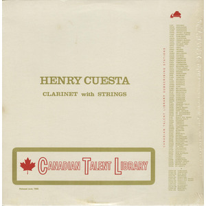 liner notes.....The most exciting, most reviewed, most acclaimed clarinetist to regularly perform in Toronto night clubs during the past several years, Henry Cuesta ranks as one of the foremost exponents of the licorice stick on this or any other continent. Following a stint in the army (where his talents were employed to entertain the troops), Henry joined the house band at the Roosevelt Hotel in New Orleans. The hotel circuit eventually led him to a spot with the Jack Teagarden group with which he toured for a number of years and made five record albums. With Toronto as his home base, Henry has for several years led his own dixieland groups, and co-starred with many of the jazz "greats" at the Colonial, the Golden Nugget and the Town Tavern, among others. On the Saturday night of the week in which this album was taped, Henry was a member of the audience that enjoyed Benny Goodman's guest appearance with the Toronto Symphony Orchestra. Later that same evening, Mr. Goodman was among the enthusiastic throng at the Colonial applauding the performance of Henry Cuesta, as he concluded a two-week engagement leading his own Goodman-style unit with vibes and a four-man rhythm section. This album finds Henry on yet another plane in which his solo clarinet is supported by a full string orchestra in arrangements especially conceived for this recording.