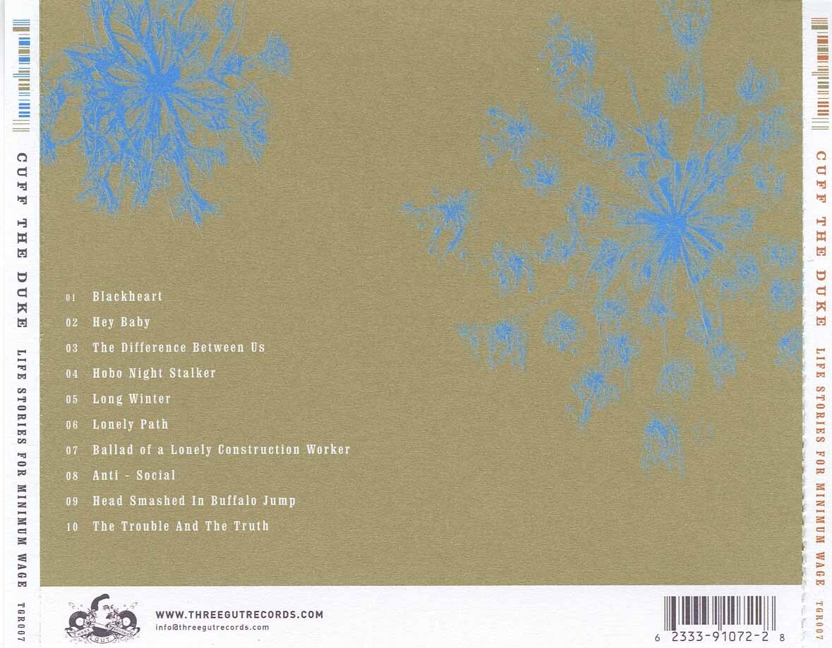 The debut album from Cuff the Duke entitled Life Stories for Minimum Wage was released in 2002 and recorded at Umbrella Sound and at The House of Miracles in Toronto. The album was originally released on the now defunct label Three Gut Records and was later re-issued in 2007 on Outside Music.