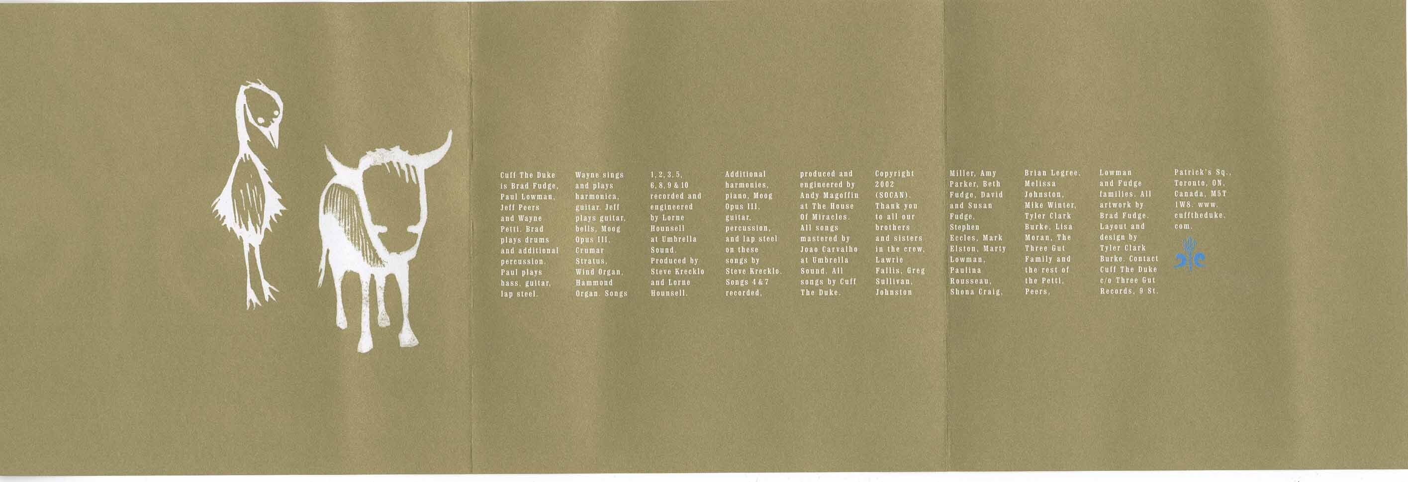 Cuff The Duke is Brad Fudge, Paul Lowman, Jeff Peers and Wayne Petti. Brad plays drums and additional percussion. Paul plays bass, guitar, lap steel. Wayne sings and plays harmonica, guitar. Jeff plays guitar, bells, Moog Opus III, Crumar Stratus, Wind Organ, Hammond Organ. Additional harmonies, piano, Moog Opus III, guitar, percussion and lap steel by Steve Kreckle.