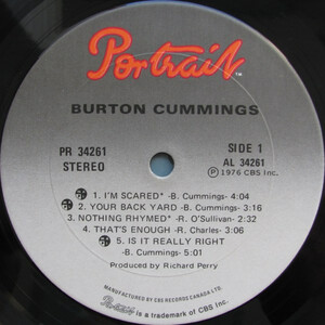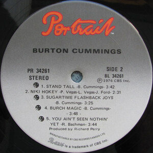Not to be missed: "I'm Scared" is a haunting song about a true experience at the beautiful Cathedral of St. Thomas in New York City. "Your Backyard" is one of Burton's patented piano-driven rockers and remains a perennial concert favourite. "Is It Really Right" is one of my personal all-time favourites. The grand piano break and the multi-layered guitar solo are definite highlights. "Stand Tall" was a huge hit for Burton (top 10 on Billboard) and marked his arrival as a solo artist. The album closes with a take of BTO's "You Ain't Seen Nothin' Yet", a slow version of the song with real four o'clock in the morning flavour. Lounge with horns! All in all, an excellent release and a must-have for all Burton Cummings fans. Released on Compact Disc on 21 September, 1999 with the bonus tracks "Blossom" (demo) and "I'm Scared" (demo). "Blossom", previously done by English singer Georgie Fame, is a nice jazzy piece in a fast 3/4 time with some nice electric piano work by Cummings. The demo of "I'm Scared" has a real live off the floor feel to it, with just piano, bass, drums and voice. It's interesting to hear what Cummings' voice sounds like without any echo or reverb, just a straight, dry vocal. This cut shows an earlier point in the evolution of the song, with lyrics, chords and melody slightly different in places than in the final version. By the way, if you can get your hands on the Quadraphonic version of the LP, it's got incredible ambiance, even in two channel stereo.