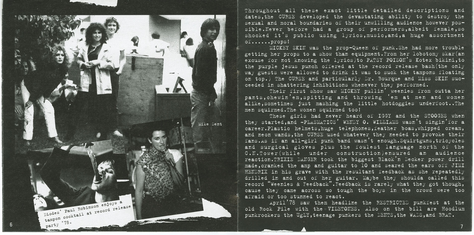 Their first shows were riotous. Performing in basements and rehearsal pits, they stunned audiences with wild, rule-breaking performances. Mickey wore a fake lobotomy scar, spit hot dogs at the crowd, and served Purple Jesus punch from a bowl filled with floating tampons. At one infamous gig, male audience members squirmed as she pulled weenies from her pants and mashed them underfoot. The bandâs visual tactics â feather boas, surgical gloves, power drills, whipped cream, squirt guns â blurred the line between punk rock and shock art.