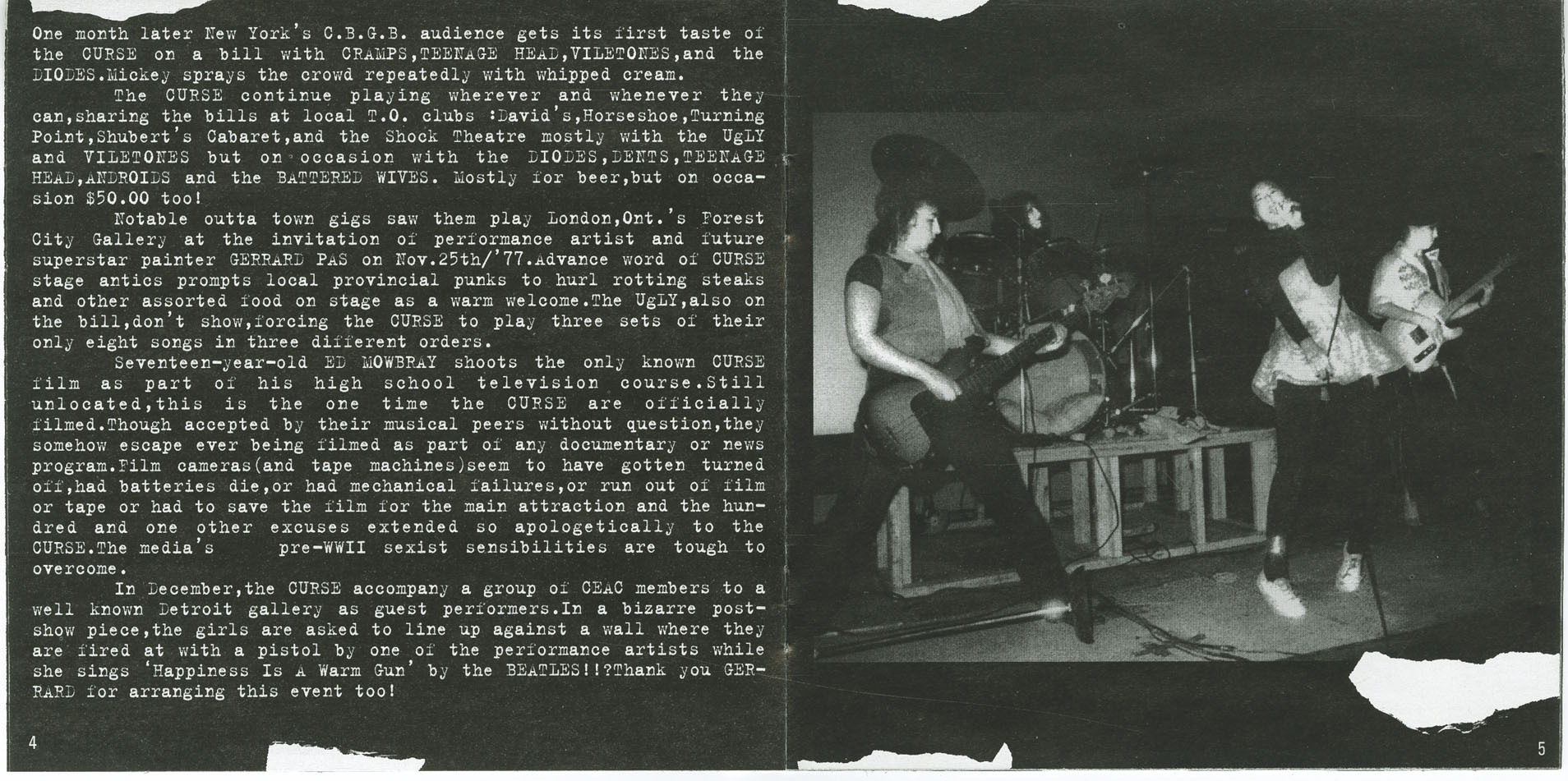 The Curse played with John Watersâ âEgg Womanâ at the Horseshoe Tavern in May 1978, opened for the Plasmaticsâ Wendy O. Williams, and even performed with CEAC artists in Detroit, where they were theatrically âexecutedâ by a fellow performance artist while âHappiness Is a Warm Gunâ played. Despite these standout moments, their chaotic energy soon took its toll. Internal tension, exhaustion, and clashes with the conservative club scene eventually pushed them to the brink.
