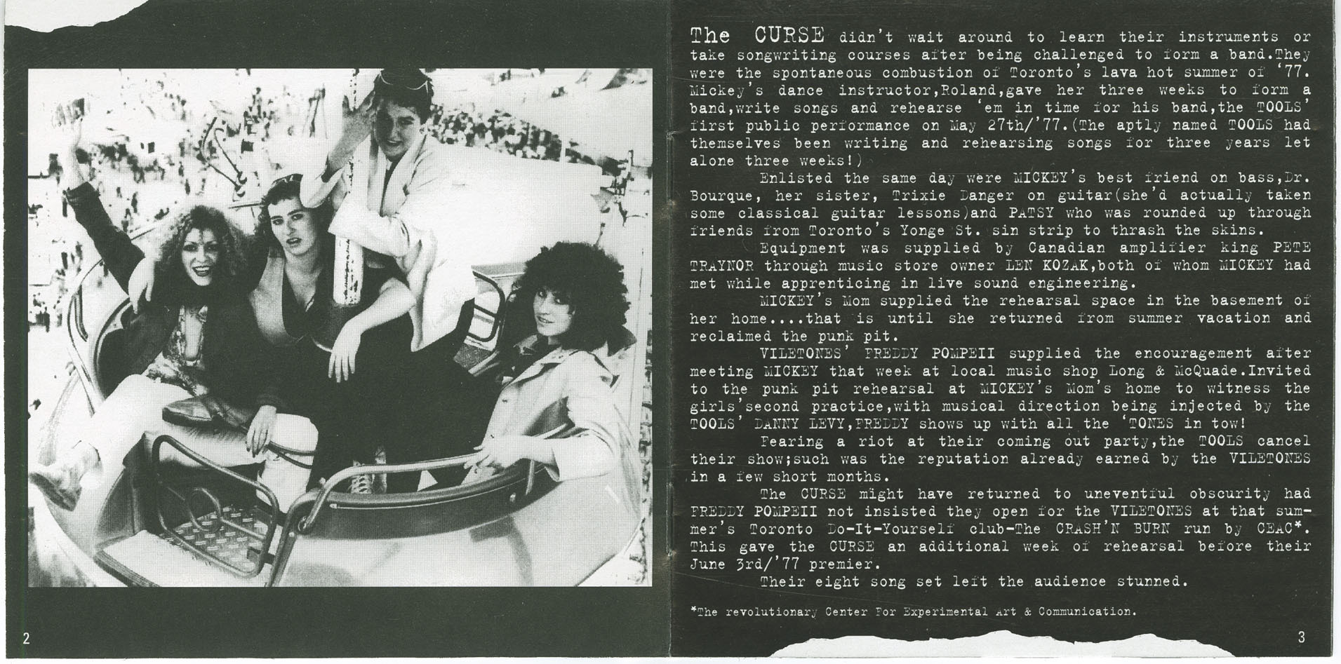Formed in May 1977 by dancer-turned-frontwoman Mickey Skin, The Curse emerged from a dare. Her dance instructor, Roland Kirouac (of The Tools), gave her three weeks to put a band together and open for his group. With no time to spare, Mickey recruited her close friend Dr. Bourque on bass, her sister Trixie Danger on guitar (whoâd taken some classical lessons), and drummer Patsy Poison, a friend from Yonge Streetâs nightlife. They had never played in bands before. Within three weeks, The Curse had written eight songs, assembled a full set, and made their debut.