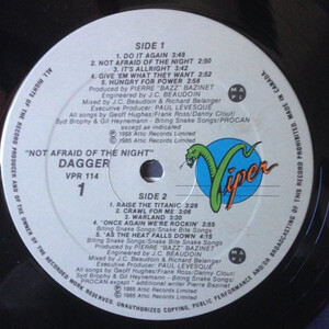 Hard Rock now, of an altogether more commercial bent from Québec's Dagger. Formed as Hell's Dagger in 1982, they shortened their name before contributing a track to the legendary, "Moose Molten Metal" compilation. This brought them to the attention of Attic Records who snapped them up and issued their only album "Not Afraid Of The Dark", through their Viper imprint in 1985. Despite their outrageous look, (click the cover to see it in all it's "glory"), Dagger were no Glam band, their sound was quite Anglophile, like an amalgam of UFO, Lone Star and Thin Lizzy, with a nice mid-'80's production job & BIG gang style choruses.