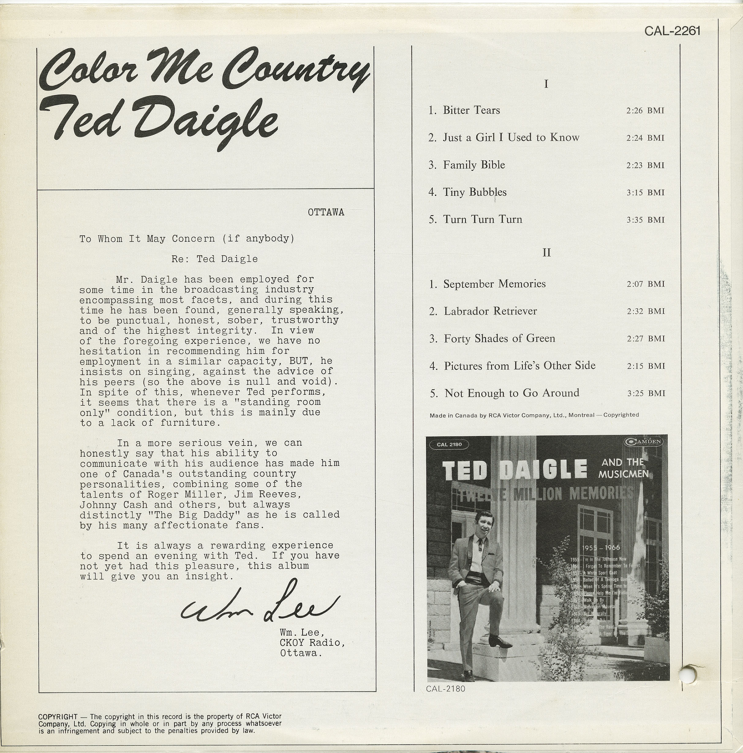 In a more serious vein, we can honestly say that his ability to communicate with his audience has made him one of Canada's outstanding country personalities, combining some of the talents of Roger Miller, Jim Reeves, Johnny Cash, and others, but always distinctly "The Big Daddy" as he is called by his many affectionate fans.