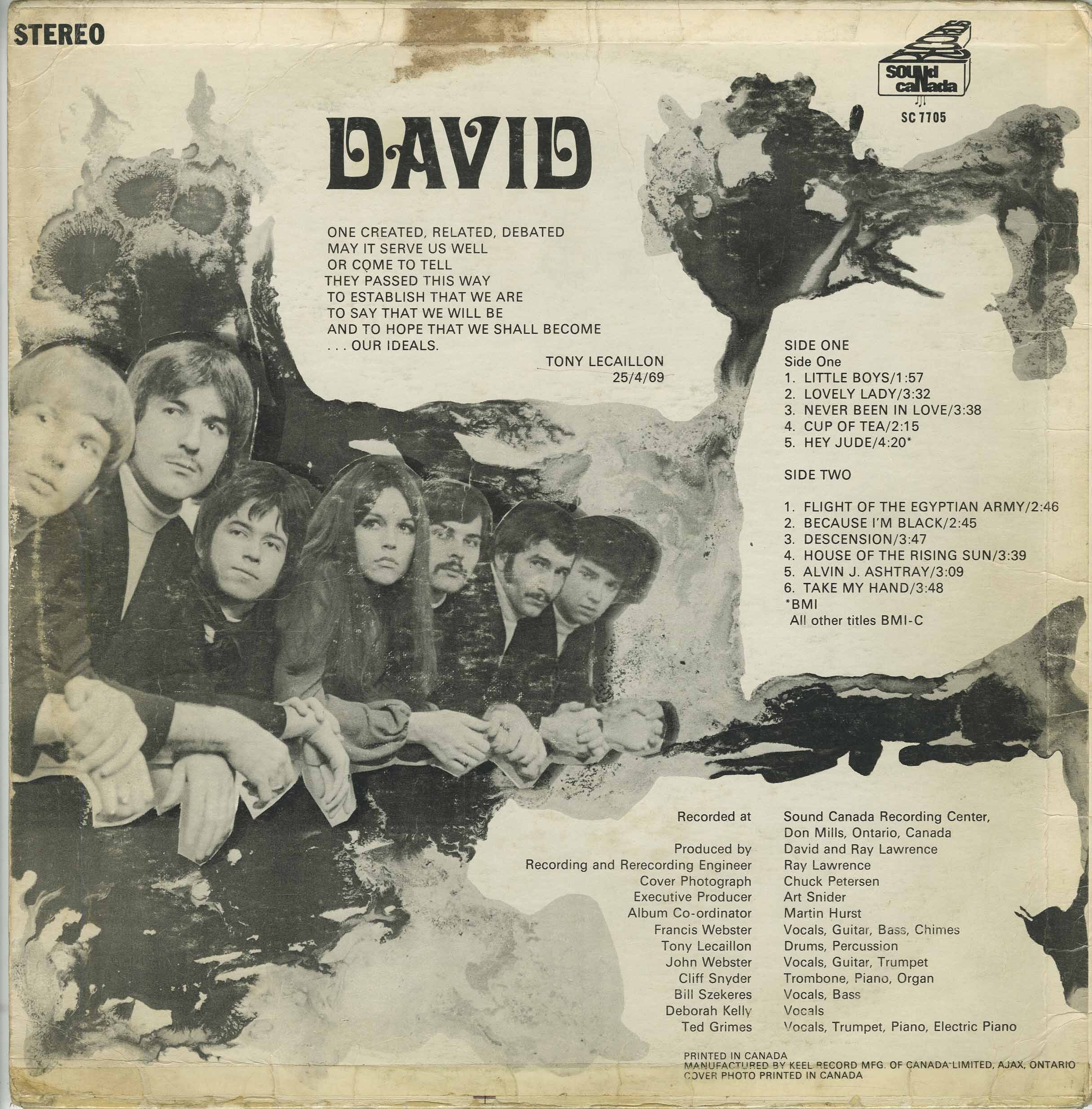 From the same label that gave us Rockadrome comes the six-man, one-woman David. Their sole album is one of those wonderful, flawed surprises from the era, an overreaching blend of orchestral pop with light psychedelic and soul touches that doesn't quite come together, yet is full of exquisite music nonetheless. The band started to take shape around 1966 when the Webster brothers, Francis and John, relocated to Toronto from nearby Collingwood, ON and hooked up with remaining members Chuck Petersen, Tony Lecaillon, Cliff Snyder, Bill Szekeres, Deborah Kelly, and Ted Grimes. By 1967, the group, still operating as the Marcatos, was purportedly drawing sizable crowds throughout the Toronto area. With a name change the following year to a more contemporary-sounding David, the band was ready to hit the studios.